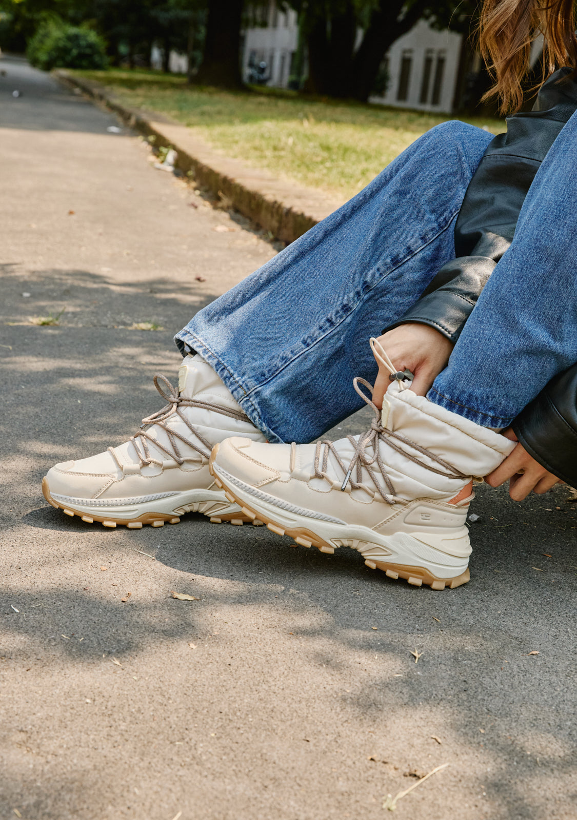 High-cut design crafted with flexible and lightweight materials. This design features a padded finish in beige tones with matching multi-position laces. It showcases our flag and lettering on both the heel and front, as well as an adjustable closure at the top.