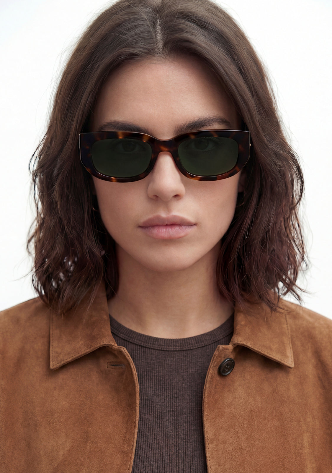 The Blaze Tort / G15 sunglasses feature a bold rectangular silhouette with a sleek tortoiseshell frame and green lenses. Inspired by retro shapes and refined with clean lines, they add a confident edge to everyday looks.