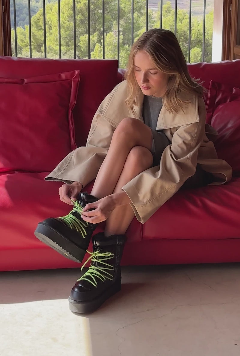 We define cold days with a warm and distinctive piece. This model is made with high-quality, lightweight, and flexible fabrics. Its double-height sole provides great comfort. Additionally, it features our custom emblem on both the heel and the side. Its green laces ensure a perfect fit and support and include reflective details.