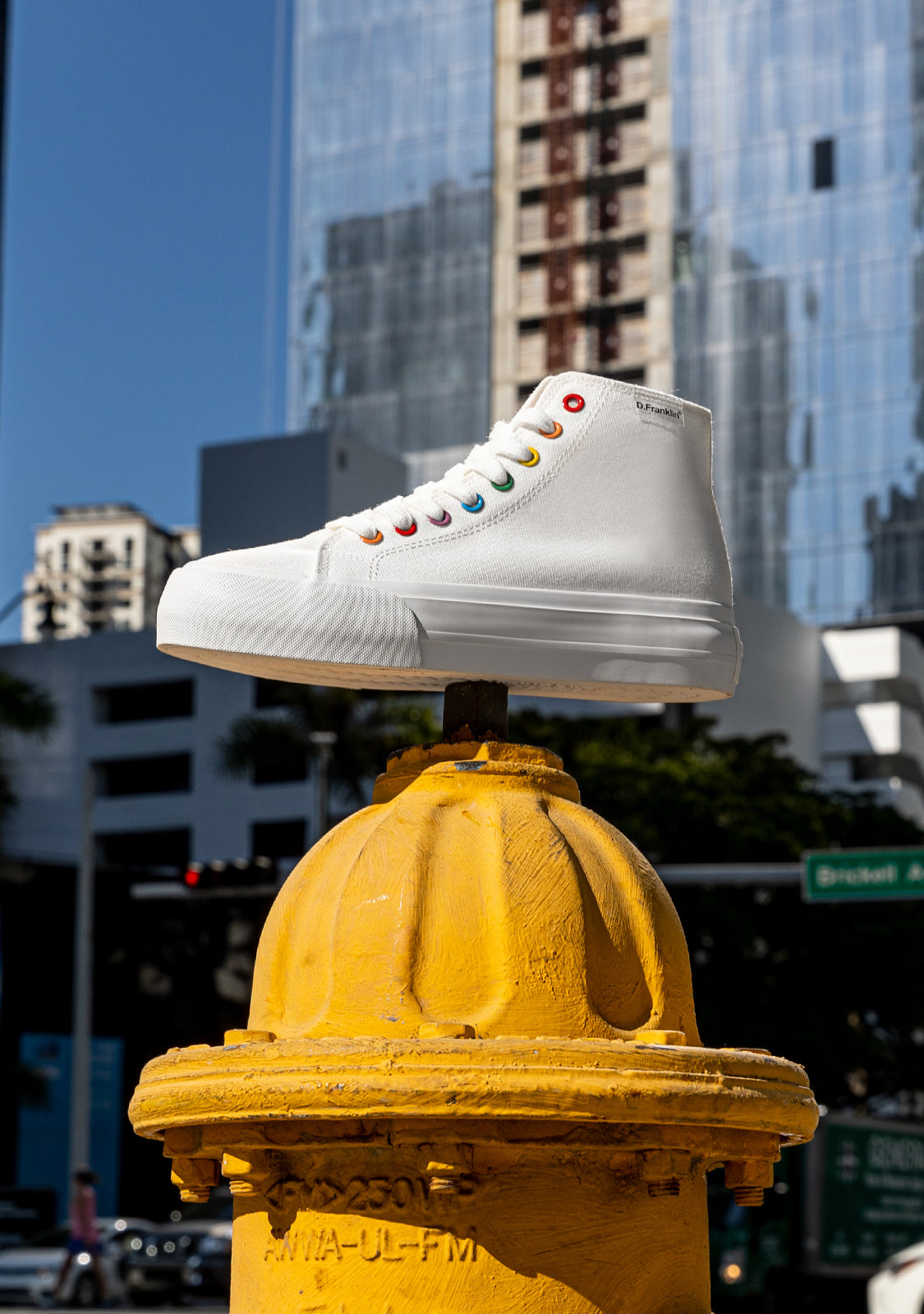 Let your creativity run wild. Bring life to every step. Inspired by the classic One Way high top trainer. Designed with red, orange, yellow, green and blue detailing for a subtle pop of colour. Constructed with an extra-light 4cm sole. Embossed logo at heel. White cotton laces.