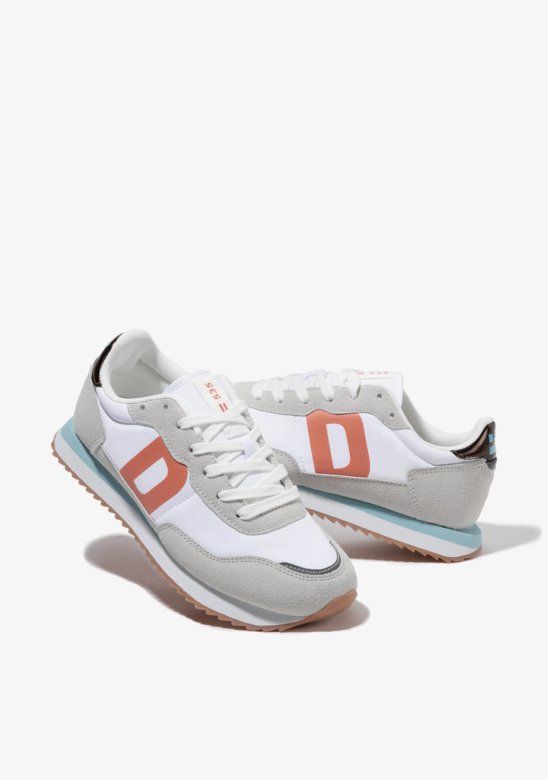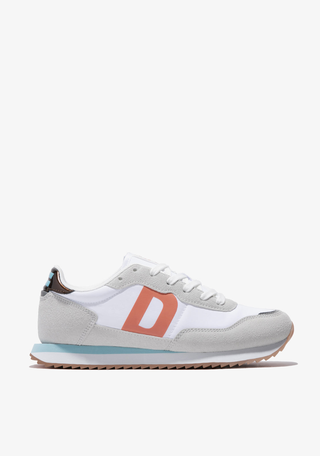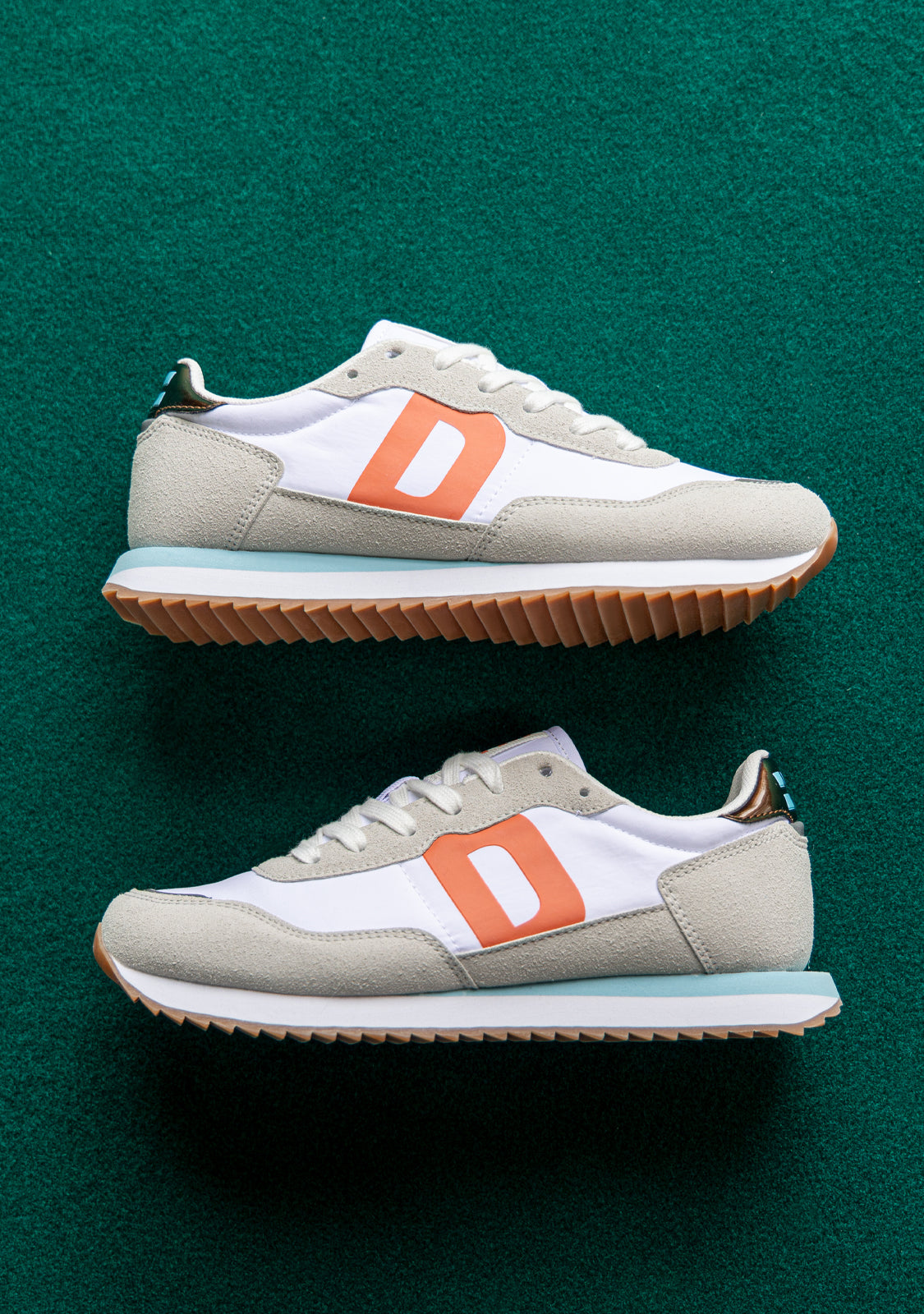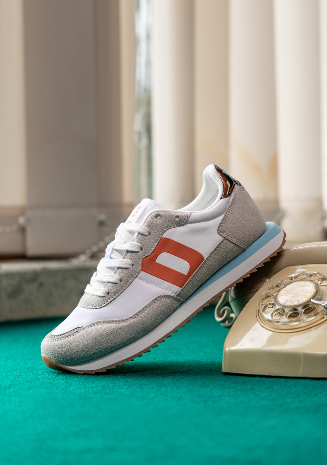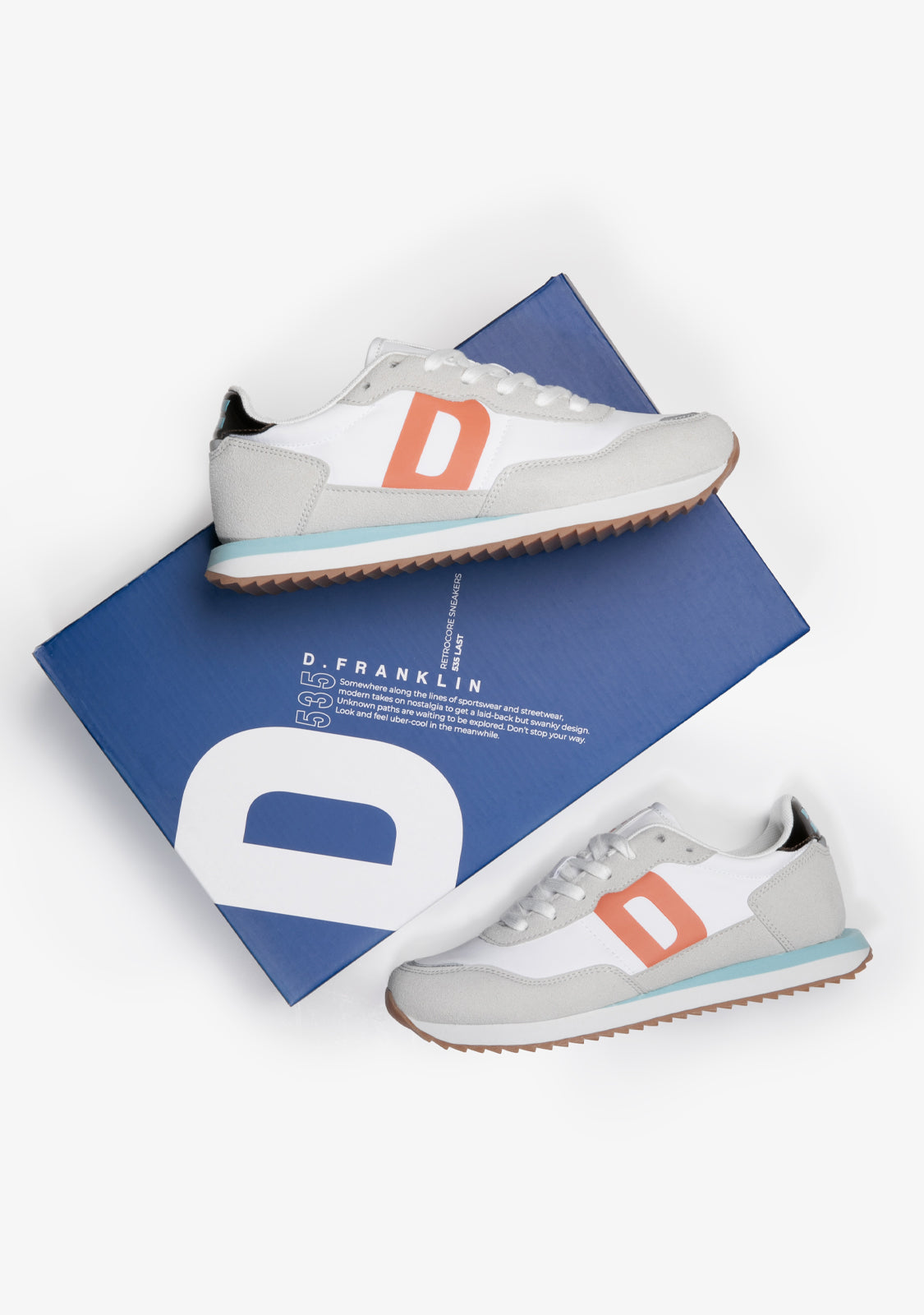 Non affecté par le passage du temps. Créé à partir de matériaux synthétiques. Semelle en combinaison de matériaux : patin en TR pour une traction maximale et wedge en EVA à double densité pour une marche ferme et confortable. Col rembourré et fermeture à lacets en coton. Logo D.Franklin embossé sur le talon et emblème bleu marine et orange sur le côté. Fait pour la ville.