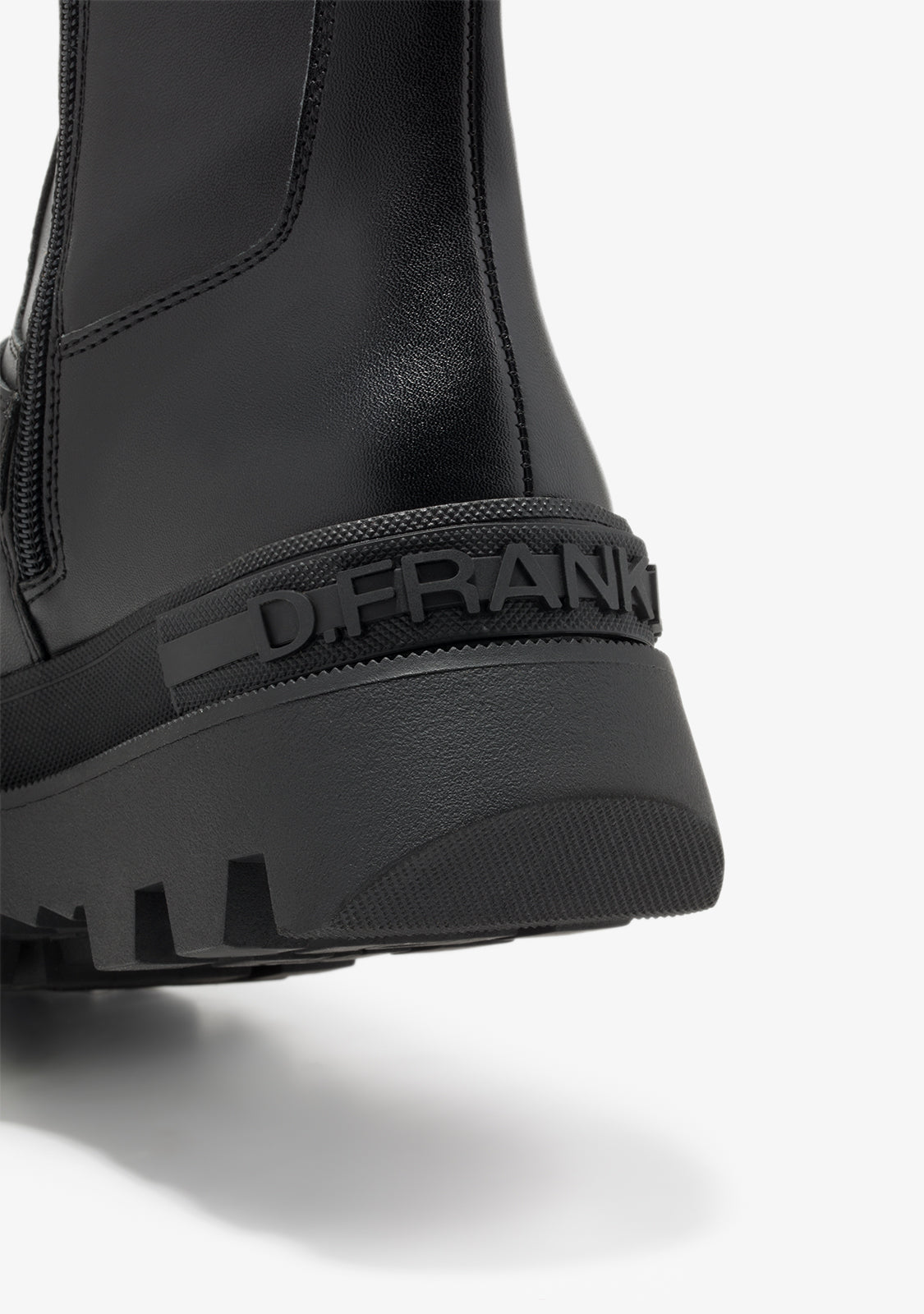 Ce modèle D.Franklin en noir présente une fermeture éclair intérieure d'un côté pour un ajustement parfait. Sa semelle de style piste offre une adhérence inégalée. Il arbore notre logo et emblème embossés sur le coin et l'orteil. De plus, il possède les détails de boucle iconiques sur la partie inférieure et supérieure, ajoutant à son esthétique caractéristique.