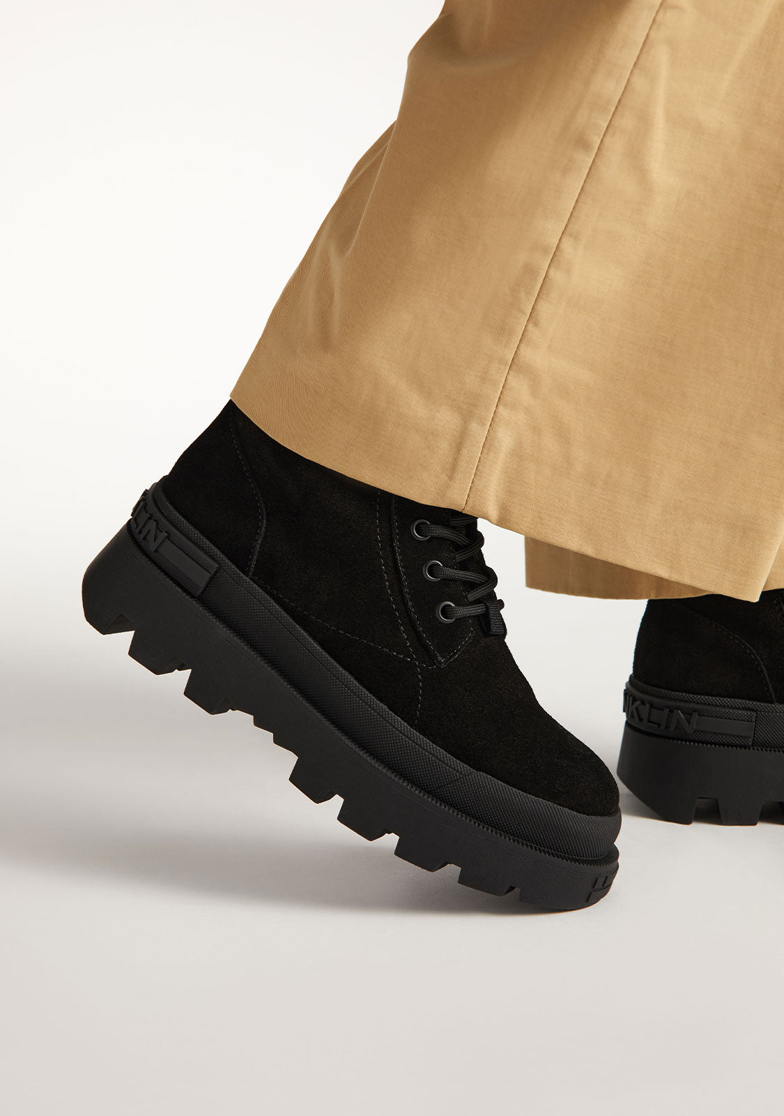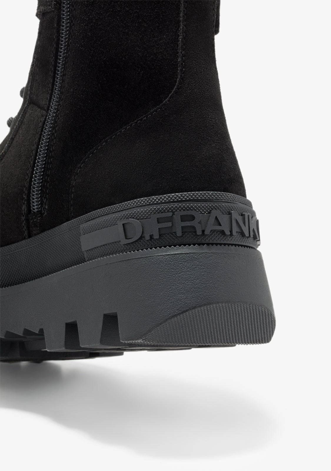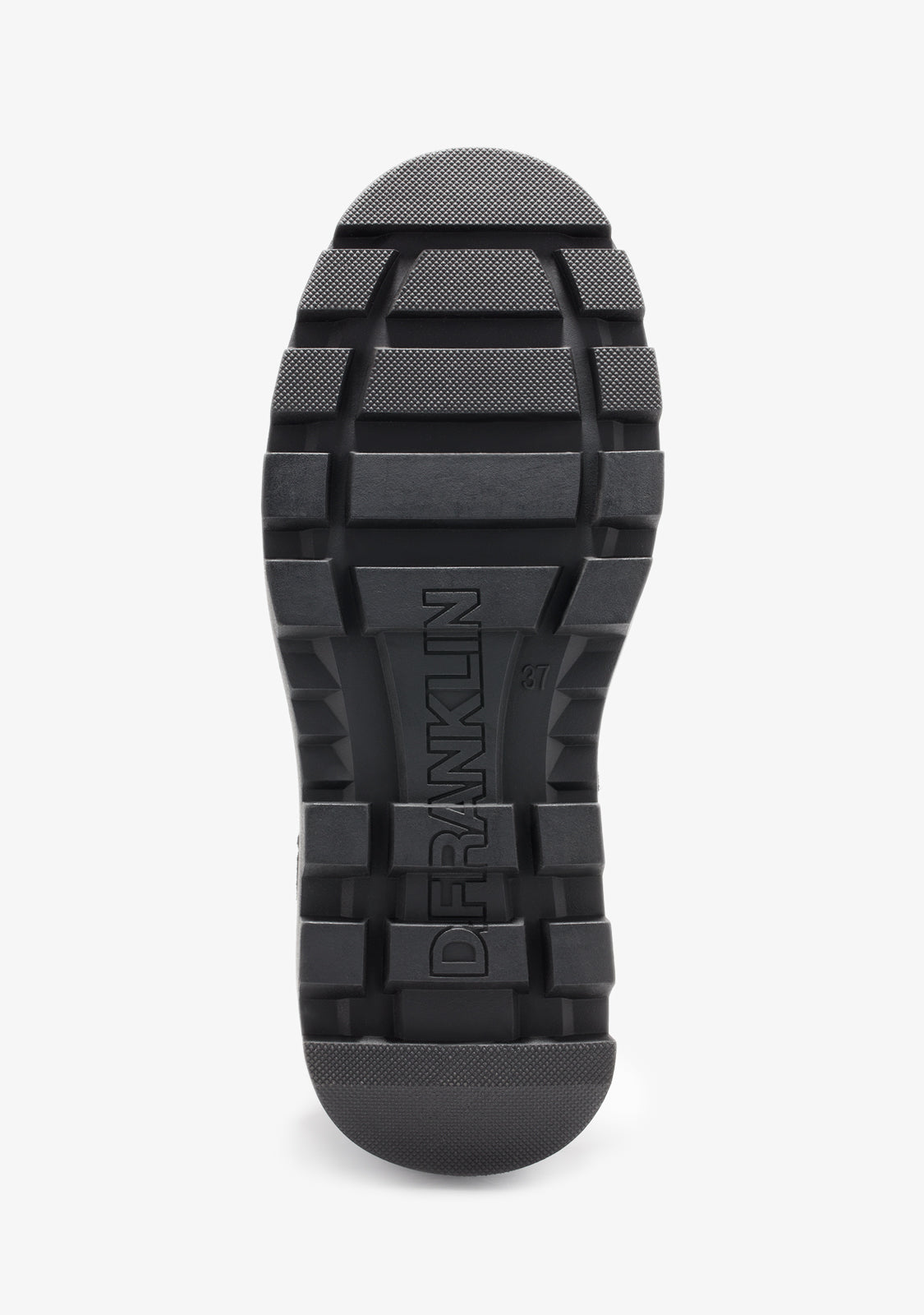 Ce modèle D.Franklin en noir présente une fermeture éclair latérale intérieure et des lacets en coton ajustables. Sa semelle de type track assure une excellente adhérence et durabilité, tandis que le logo et l’emblème sont subtilement embossés sur la semelle compensée et la pointe.