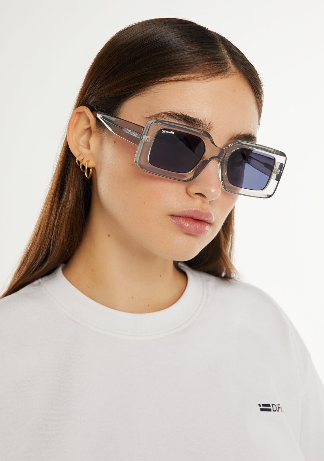 Notre modèle Bahamas en tons de gris a les détails distinctifs de la marque D.Franklin, le logo gravé sur les branches et l'emblème sur la lentille. La largeur de la lentille est de 51 mm et l'avant mesure 146 mm. Les branches latérales mesurent 145 mm de long.