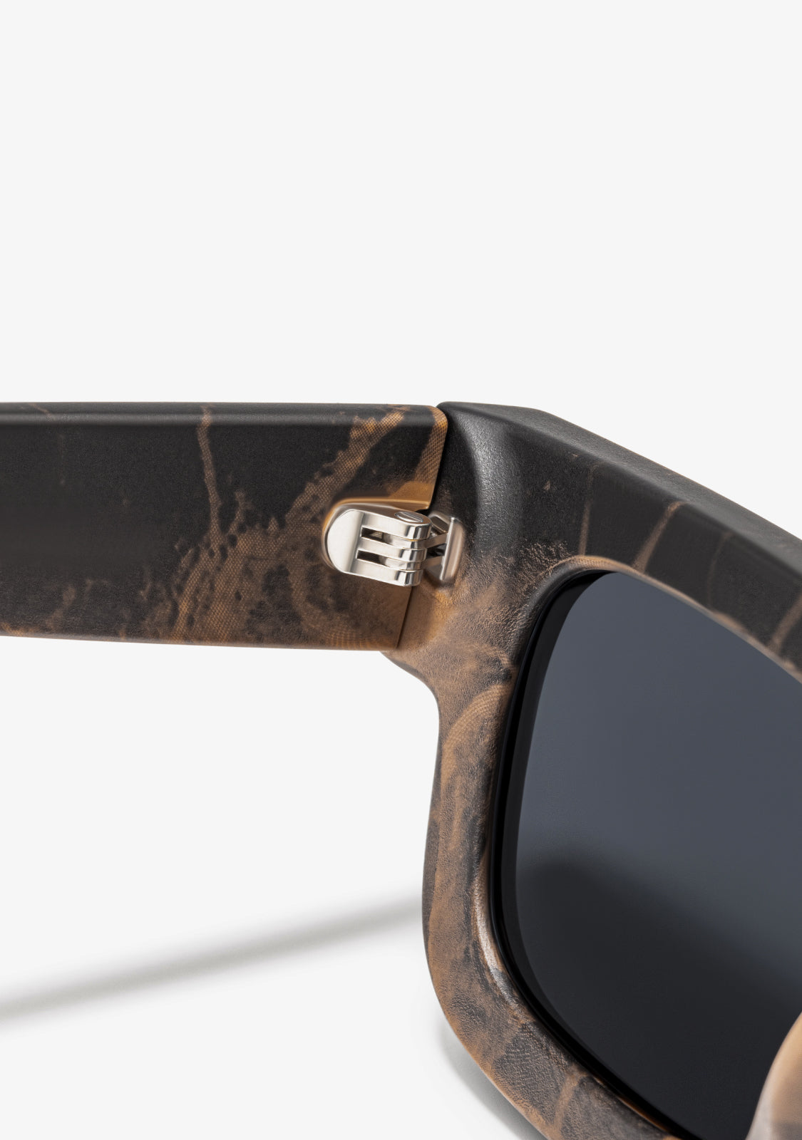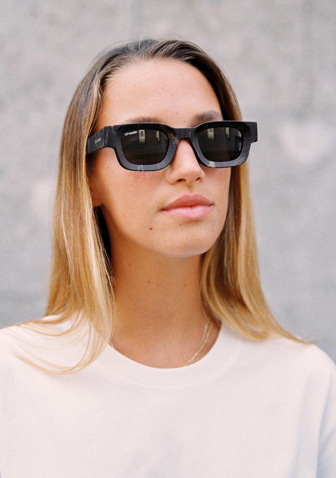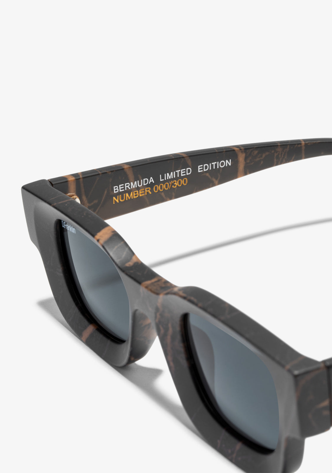 Bermuda Wood Grey est un design à finition mate fabriqué à partir de matériaux inspirés par des pierres volcaniques. Des montures épaisses et des verres fumés représentent nos différents prismes, encadrés dans une silhouette rectangulaire surdimensionnée spécialement conçue pour interagir avec de nouveaux espaces.