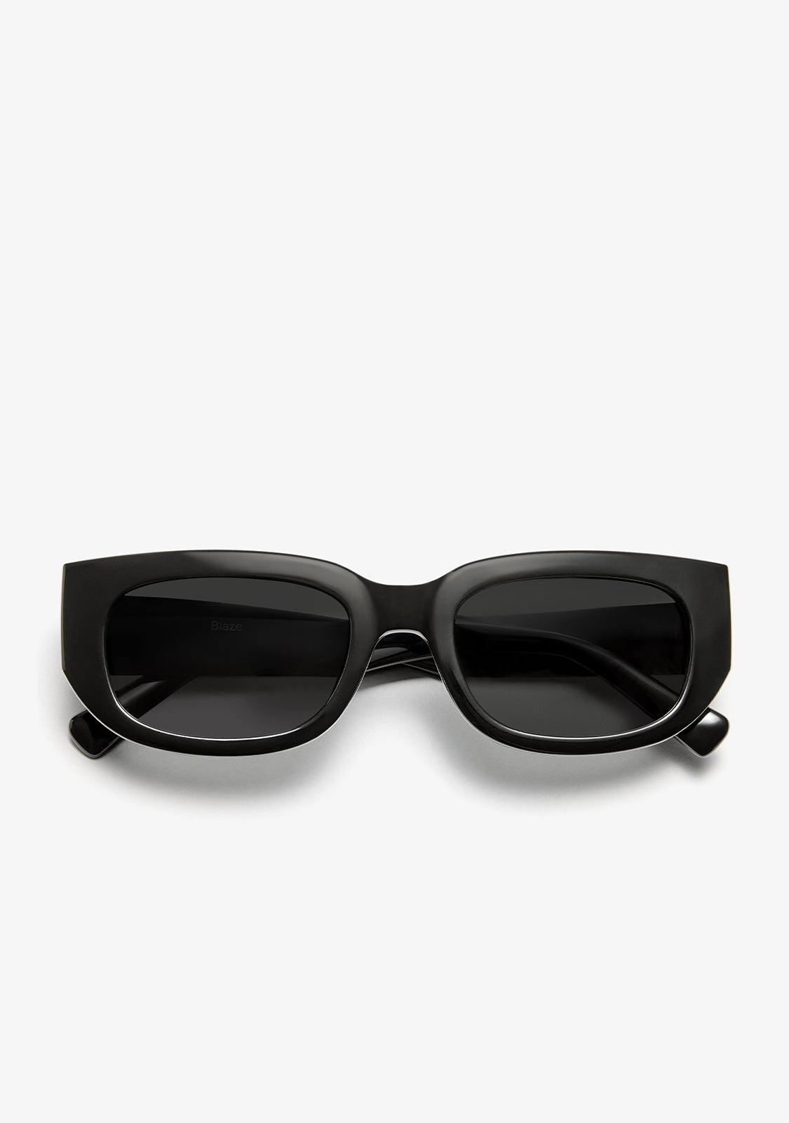 Les lunettes de soleil Blaze Black / Black présentent une silhouette rectangulaire audacieuse avec une finition entièrement noire. Inspirées par des formes rétro et raffinées avec des lignes épurées, elles ajoutent une touche de confiance aux looks quotidiens.