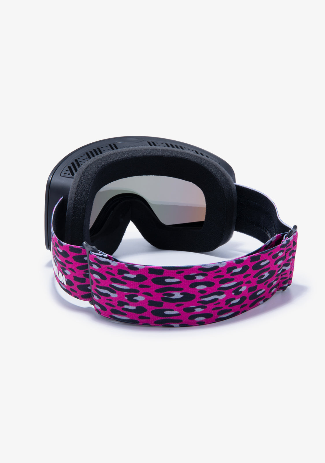 Ce modèle inspiré des sommets présente des lentilles en polycarbonate miroir sans limites ni cadre. Il dispose d'une finition argent, rose et noir avec notre emblème signature sur le côté de sa bandoulière élastique à imprimé léopard. La largeur uniforme des lentilles est de 179,5 mm.