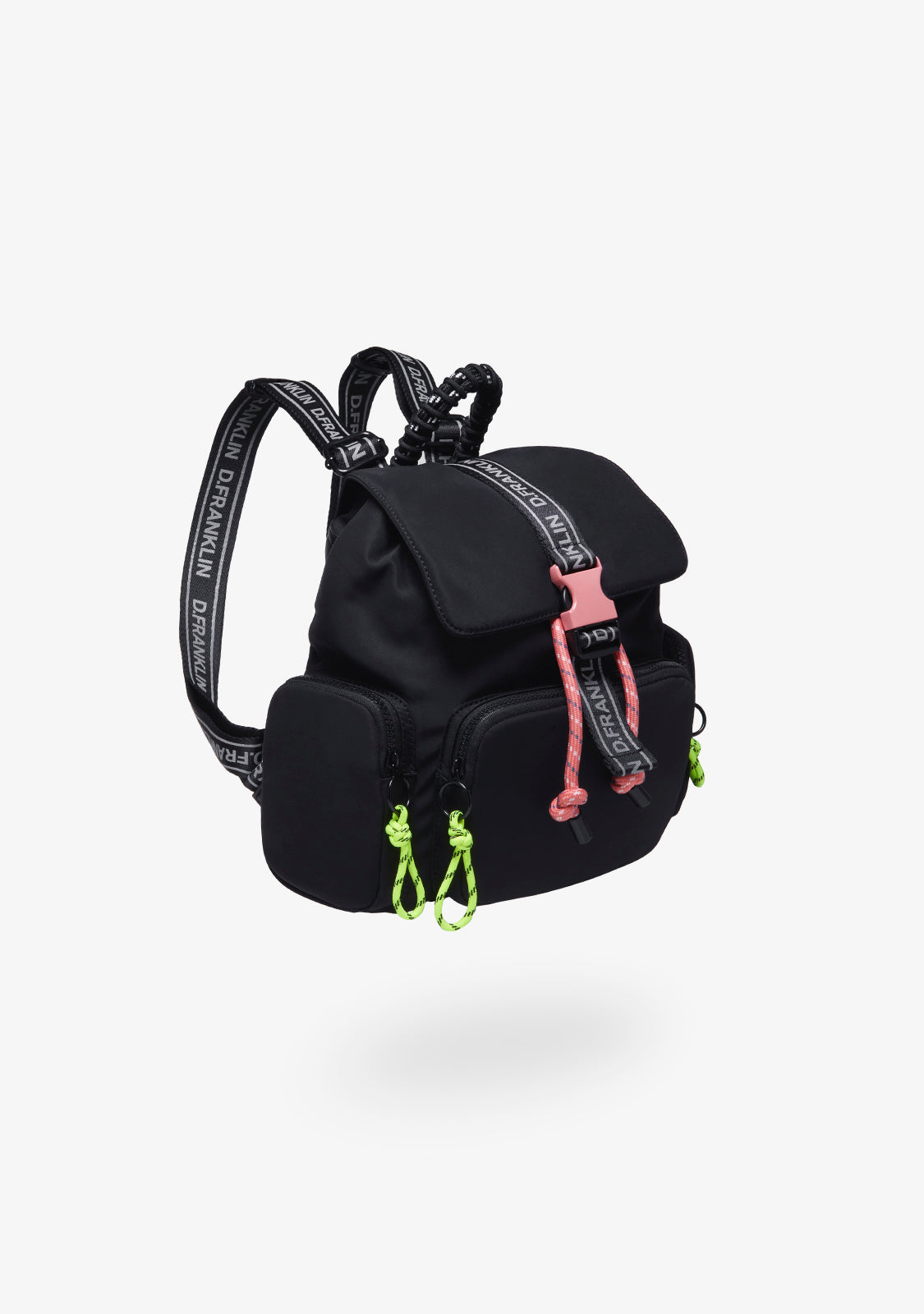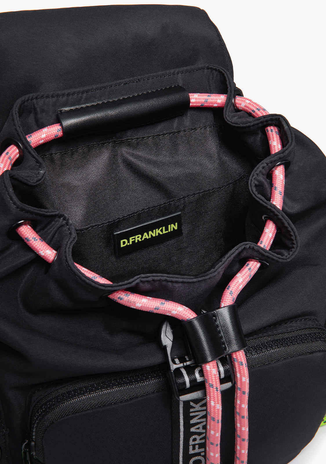 Ce design noir est fabriqué en 100 % polyester, tandis que son intérieur est doublé en coton. Il possède de petits détails contrastants en tons citron et fuchsia qui lui donnent une touche unique et différenciante. Il dispose également d'une fermeture à clip et de bretelles ajustables.