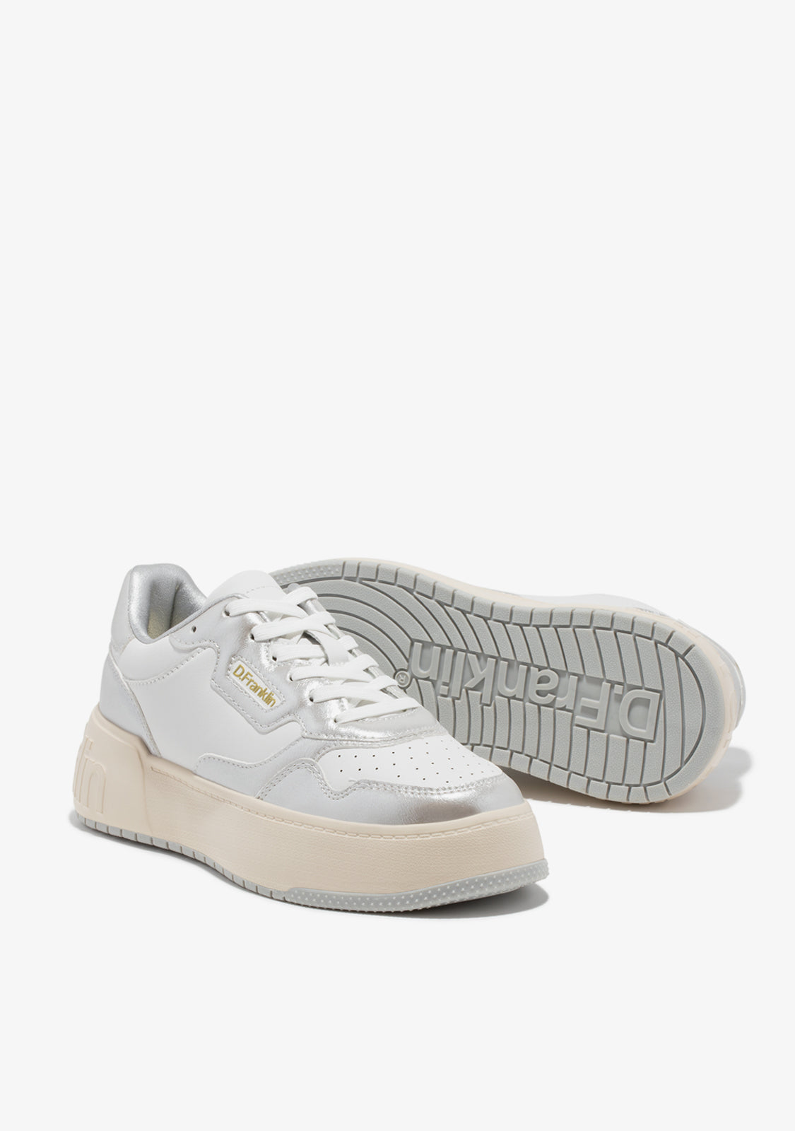 Les baskets blanches Court D.Franklin sont fabriquées avec des détails en argent et des lacets en coton. La semelle contrastante présente un logo embossé à la fois sur le talon et sur la semelle. Elles ont une hauteur de 4 cm et une semelle en phylon pour un amorti léger.