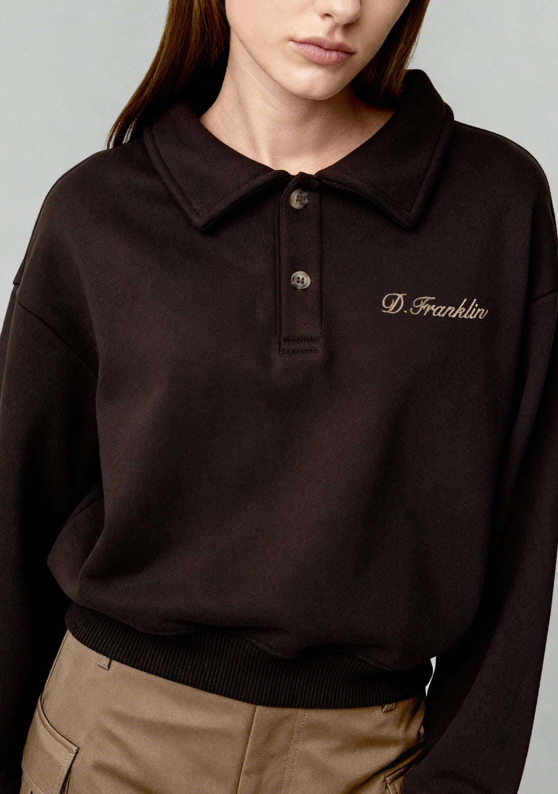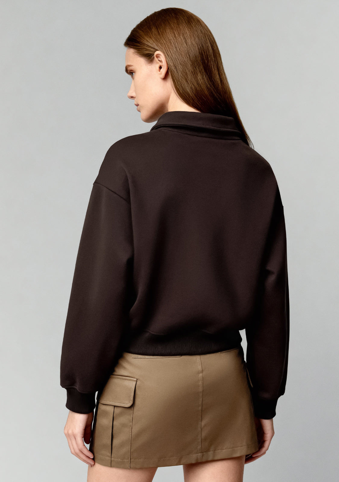 Cropped Polo Sweatshirt Brown est un sweatshirt pour femme qui revisite une coupe classique avec une touche moderne. Sa coupe courte et son col polo en font une pièce facile à porter au quotidien.