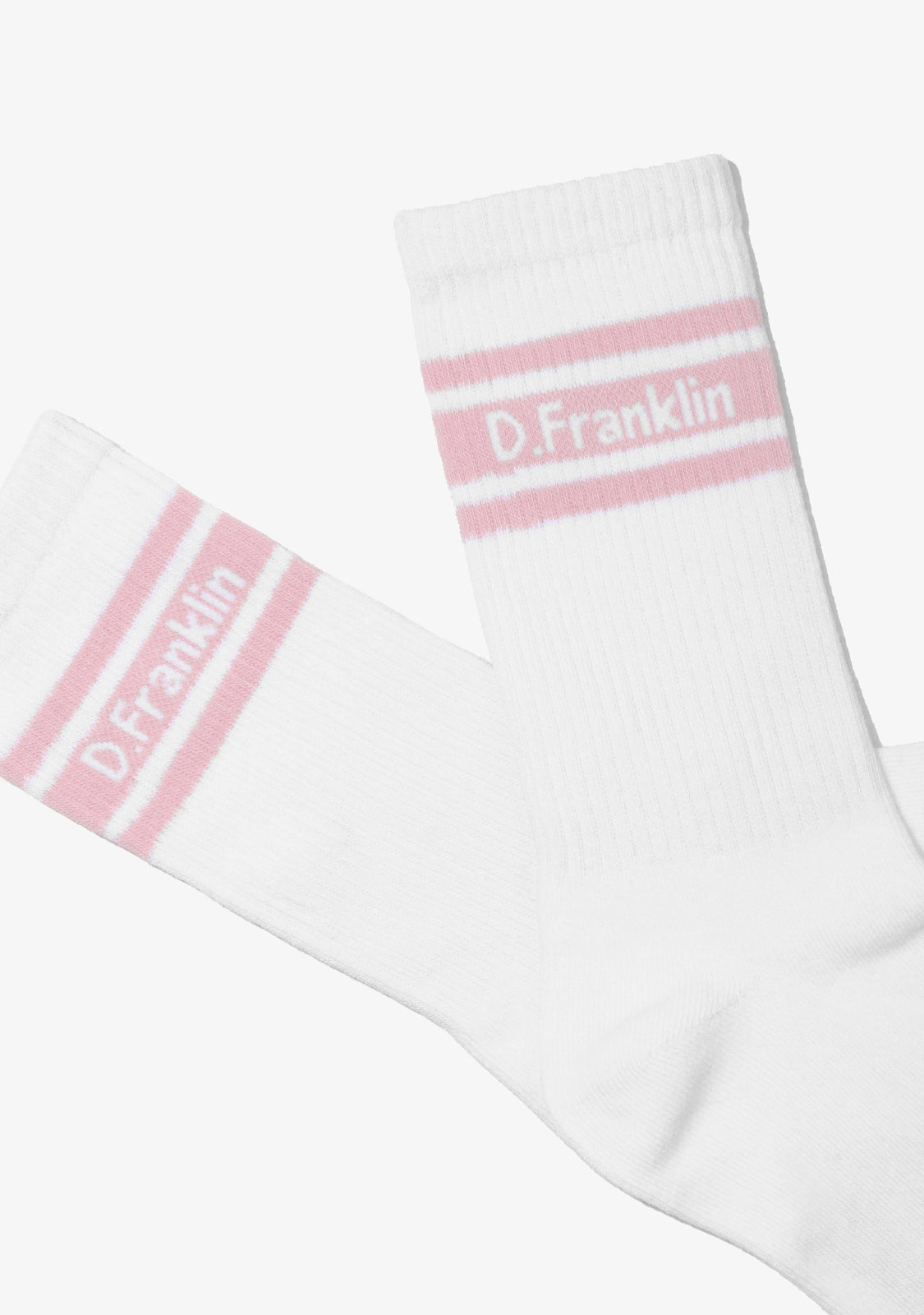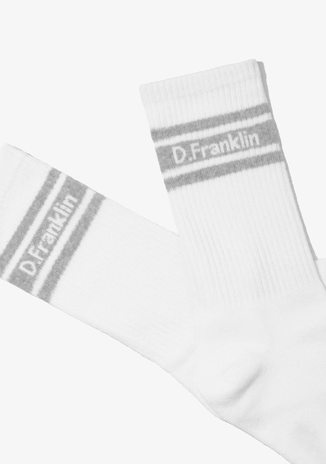 Le pack comprend trois paires en blanc, chacune finie avec des détails de rayures pastel en menthe, gris et rose et un branding D.Franklin pour une signature subtile.