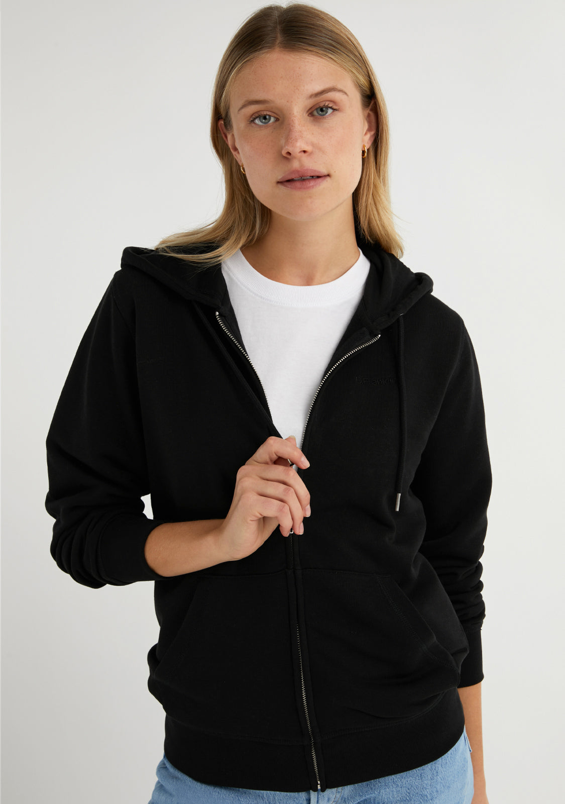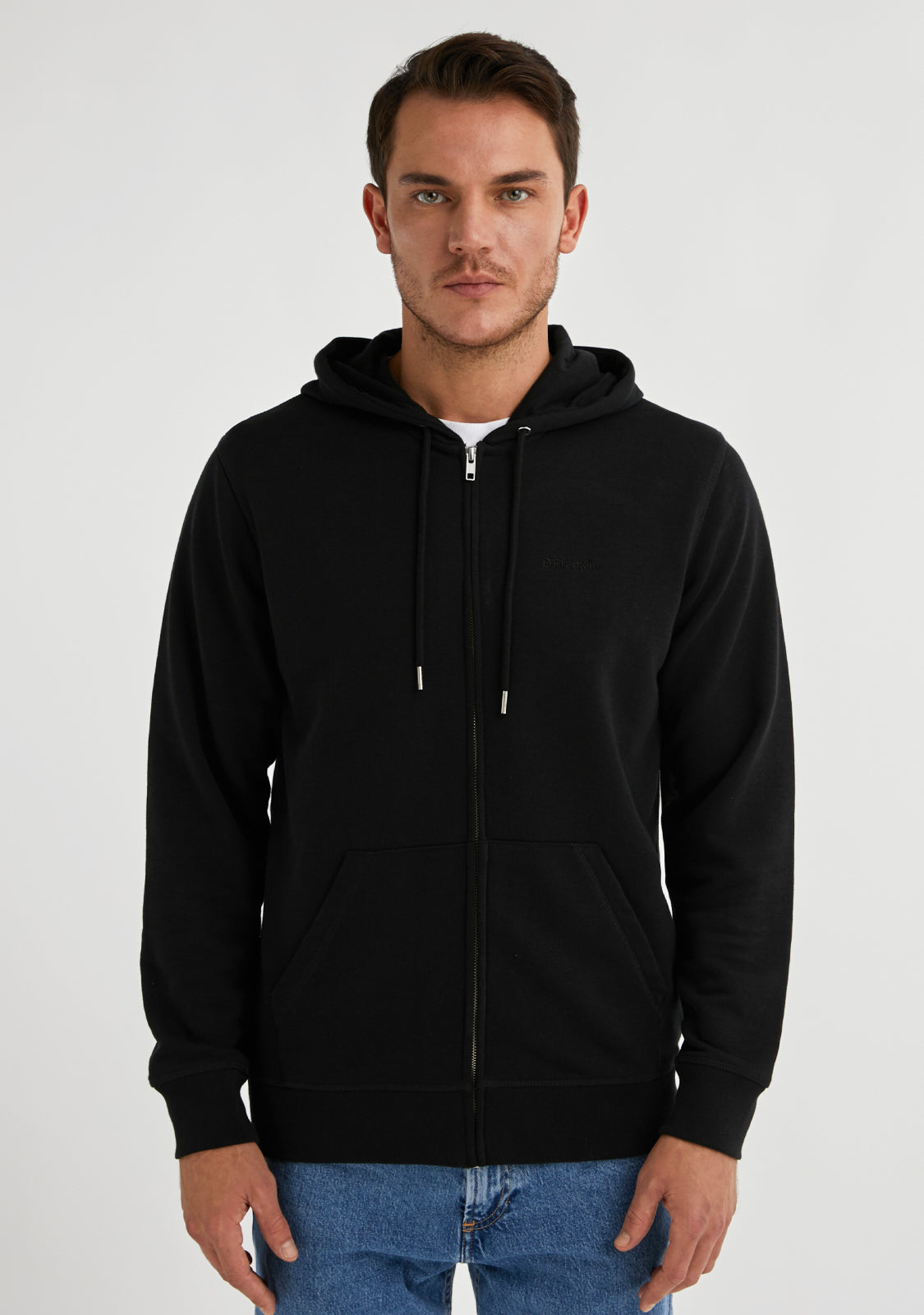 Rejoignez la tendance confortable avec notre Hoodie zippé noir avec logo brodé. Il possède une fermeture éclair centrale couverte et une capuche. Fabriqué en coton biologique. Poche kangourou pratique. Manches ajustées. Il vous offrira une grande respirabilité, élasticité et confort.