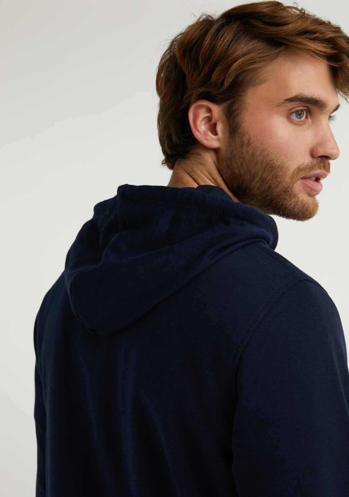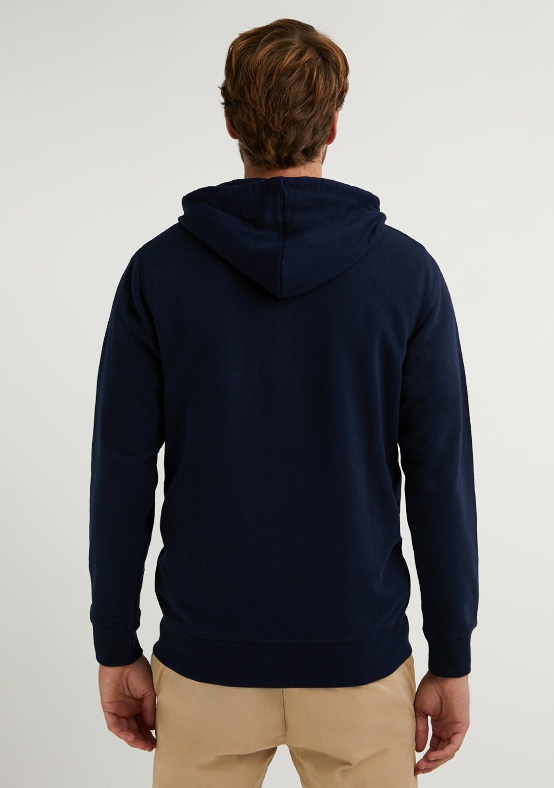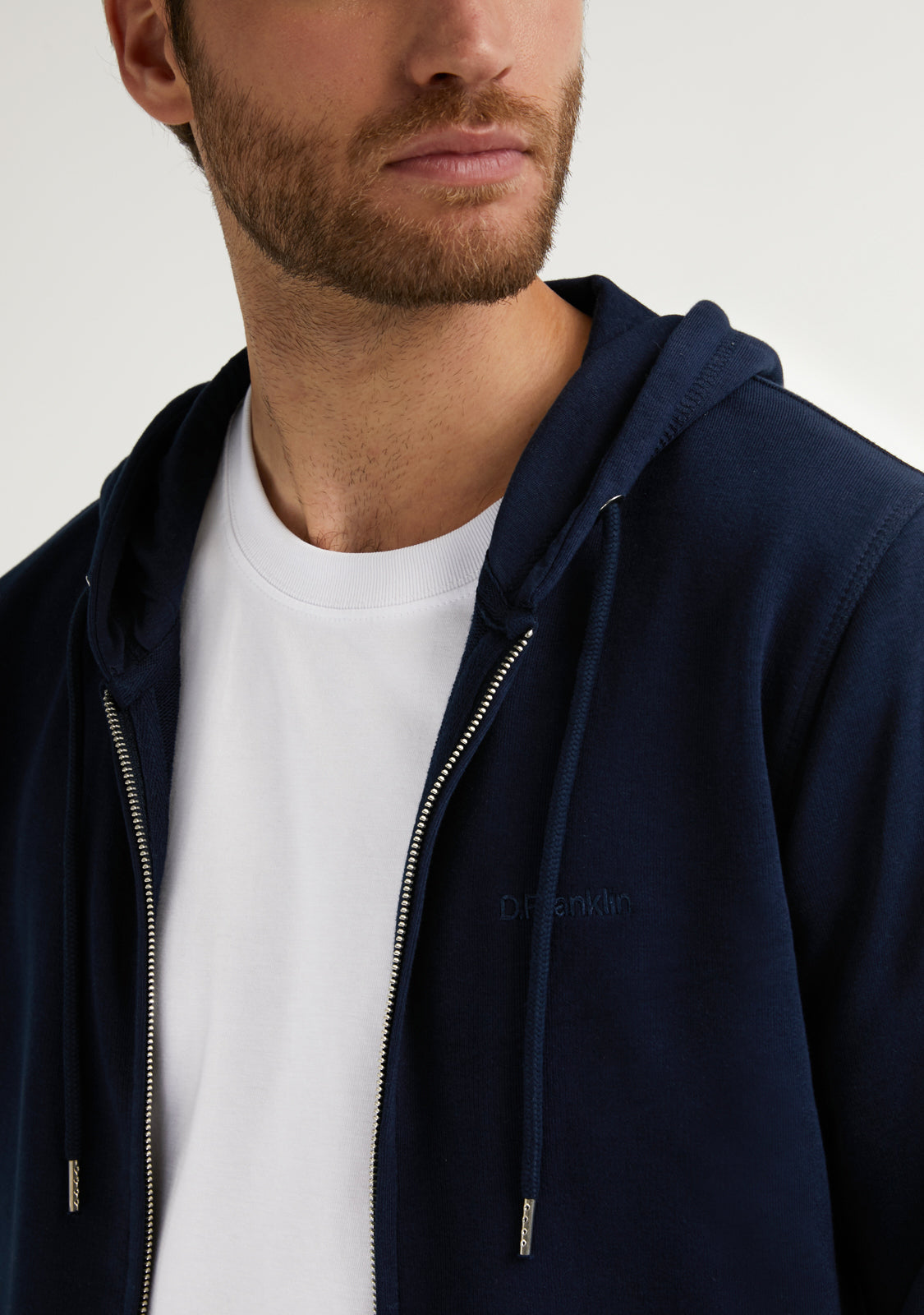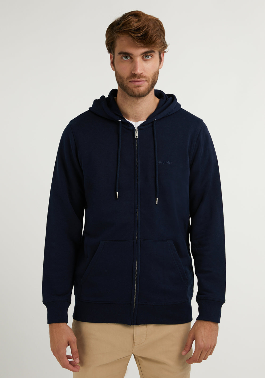 Rejoignez la tendance confortable avec notre Hoodie zippé avec logo brodé en bleu marine. Il présente une fermeture éclair centrale cachée et une capuche. Fabriqué en coton biologique. Poche kangourou pratique. Manches ajustées. Il vous offrira une excellente respirabilité, élasticité et confort.