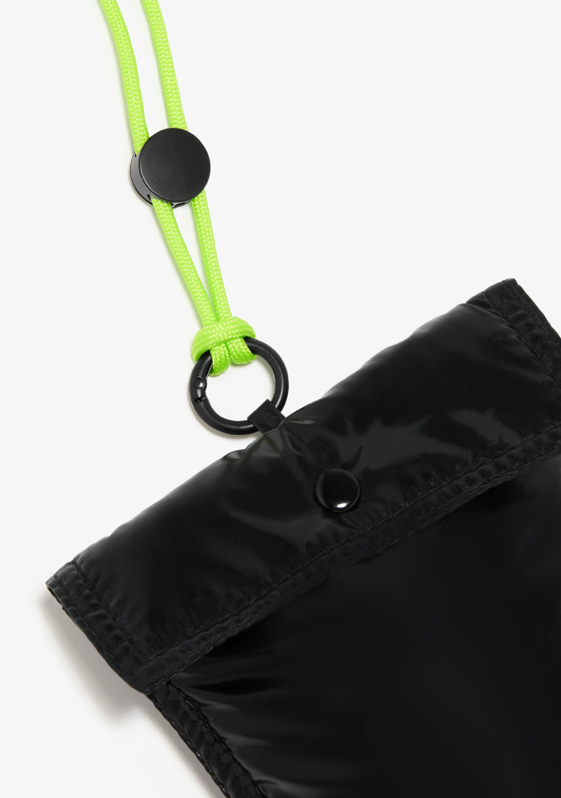 Ce modèle avec une finition noire irisée a un cordon amovible de couleur citron grâce à son anneau en métal qui permet d'adapter sa longueur. Il dispose d'une fermeture à bouton et d'un logo D.Franklin sérigraphié de couleur citron à l'avant.