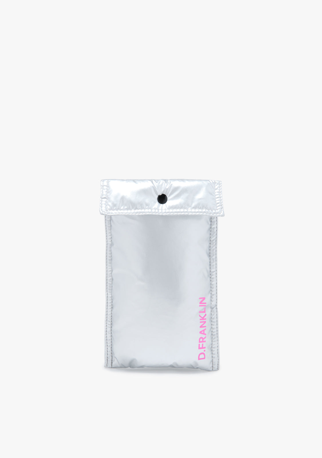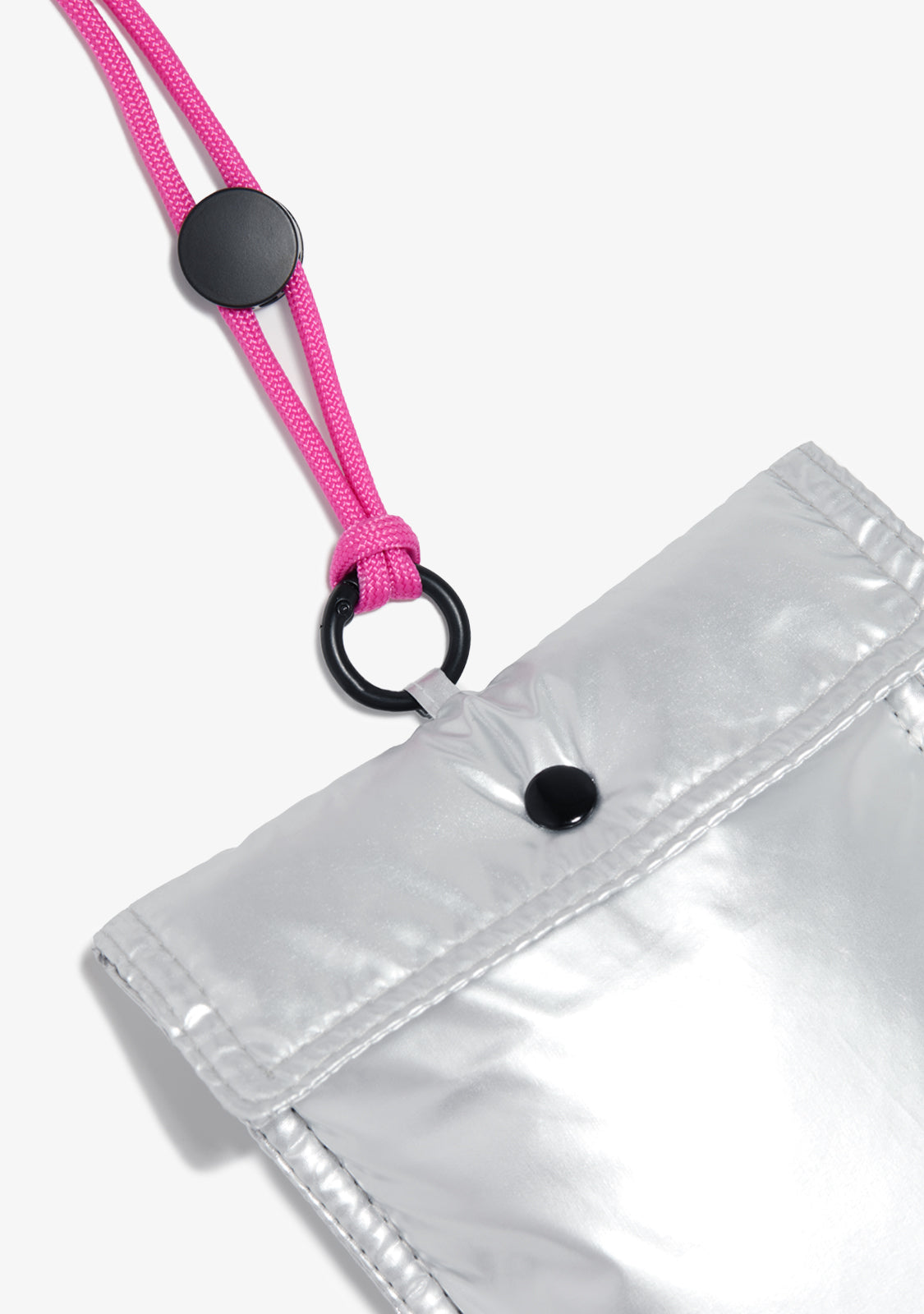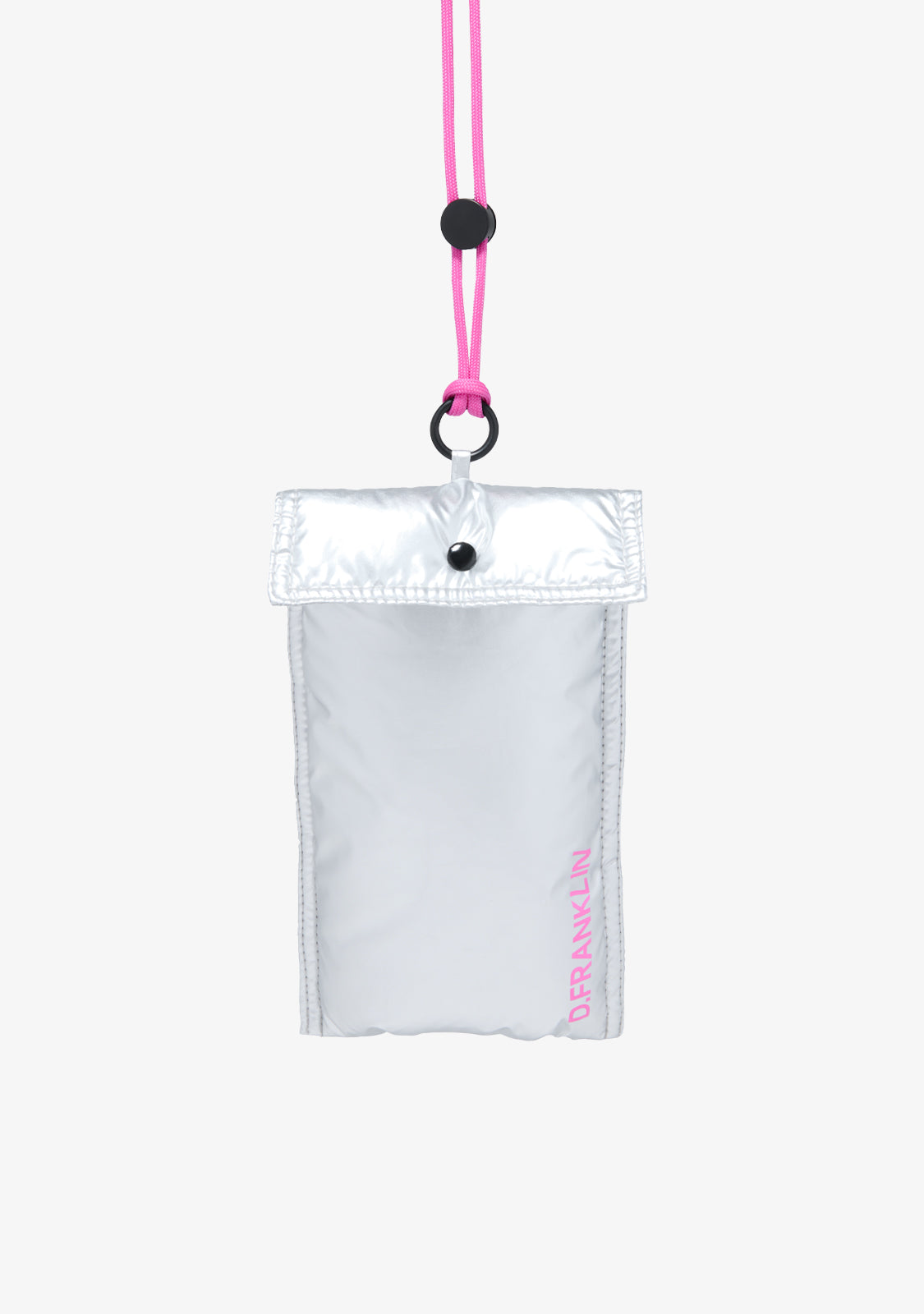 Ce modèle avec une finition argent irisé dispose d'une cordelière fuchsia amovible grâce à son anneau en métal qui permet d'adapter sa longueur. Il est équipé d'une fermeture à bouton et d'un logo D.Franklin sérigraphié fuchsia sur le devant.