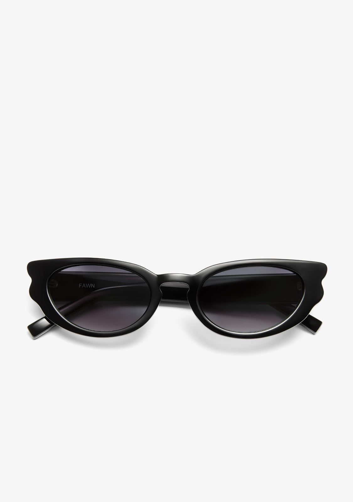 Lunettes de soleil d’inspiration œil de chat avec une silhouette élégante et sophistiquée. Leurs coins relevés et leur ligne supérieure bien définie intensifient le regard, apportant un style féminin et affirmé. Le modèle Fawn Black / Gradient Black associe une monture noire à des verres dégradés, créant un look actuel et polyvalent.