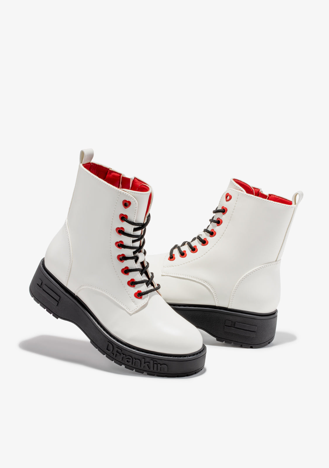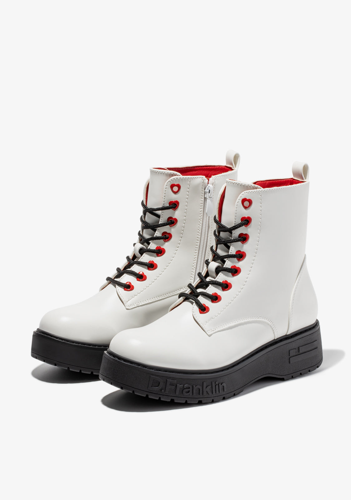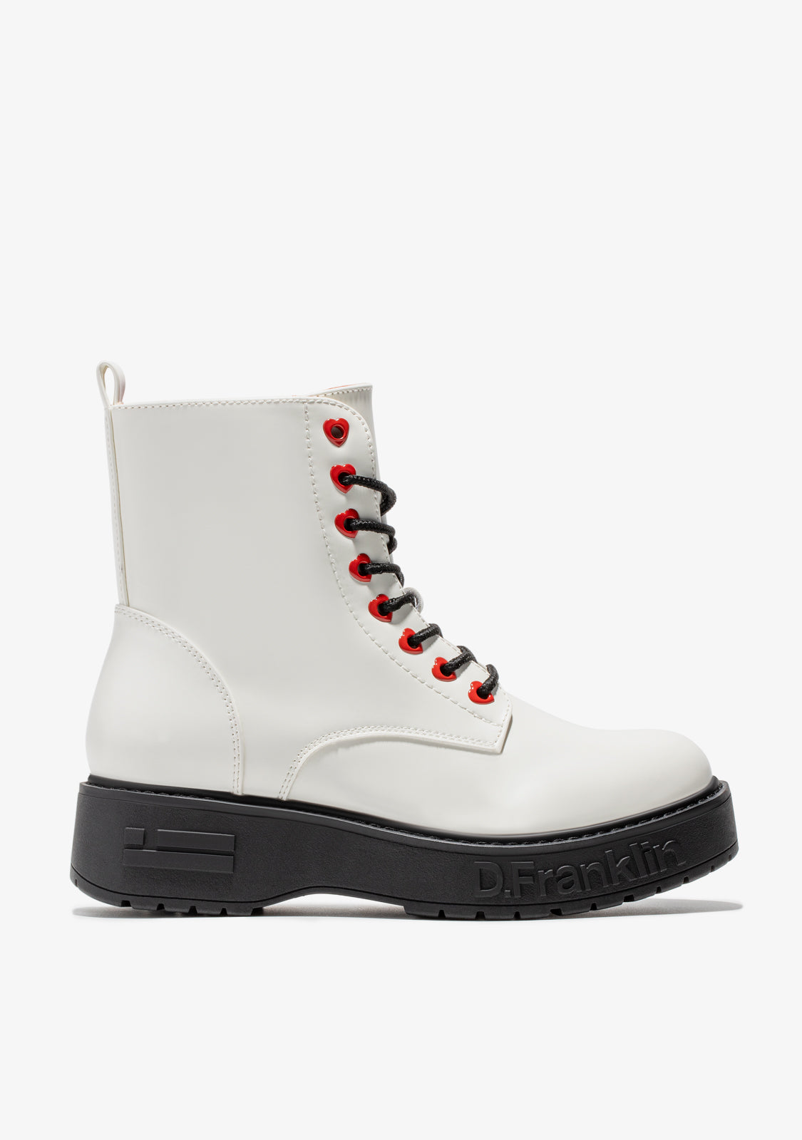 Ce modèle blanc D.Franklin dispose d'une fermeture éclair latérale intérieure et de œillets en forme de cœur pour un ajustement parfait. Une semelle de style piste offre une adhérence inégalée. Le logo embossé et la personnalisation de l'emblème sur la semelle compensée et le capuchon de orteil.