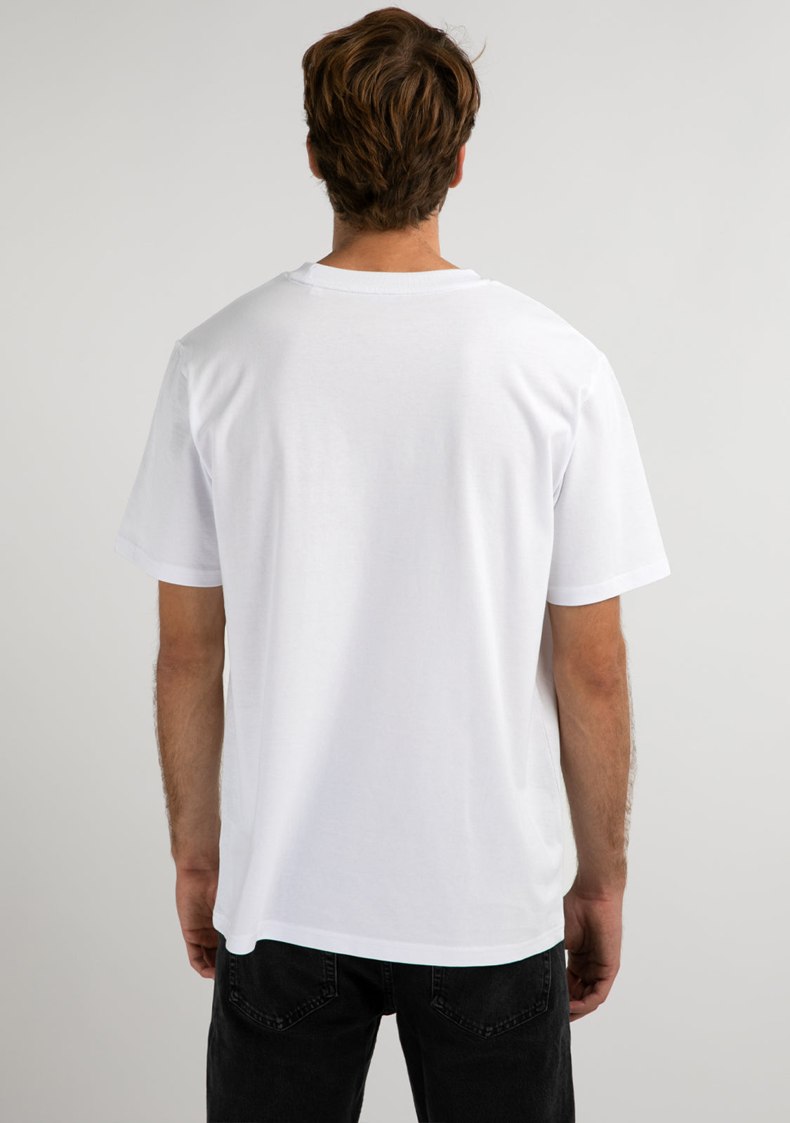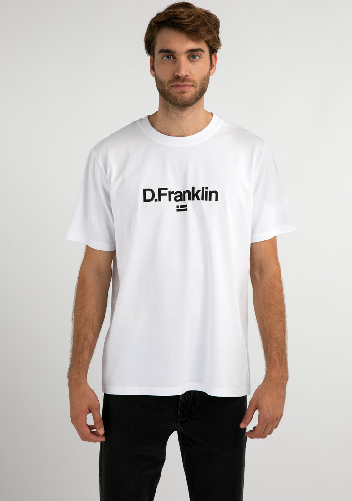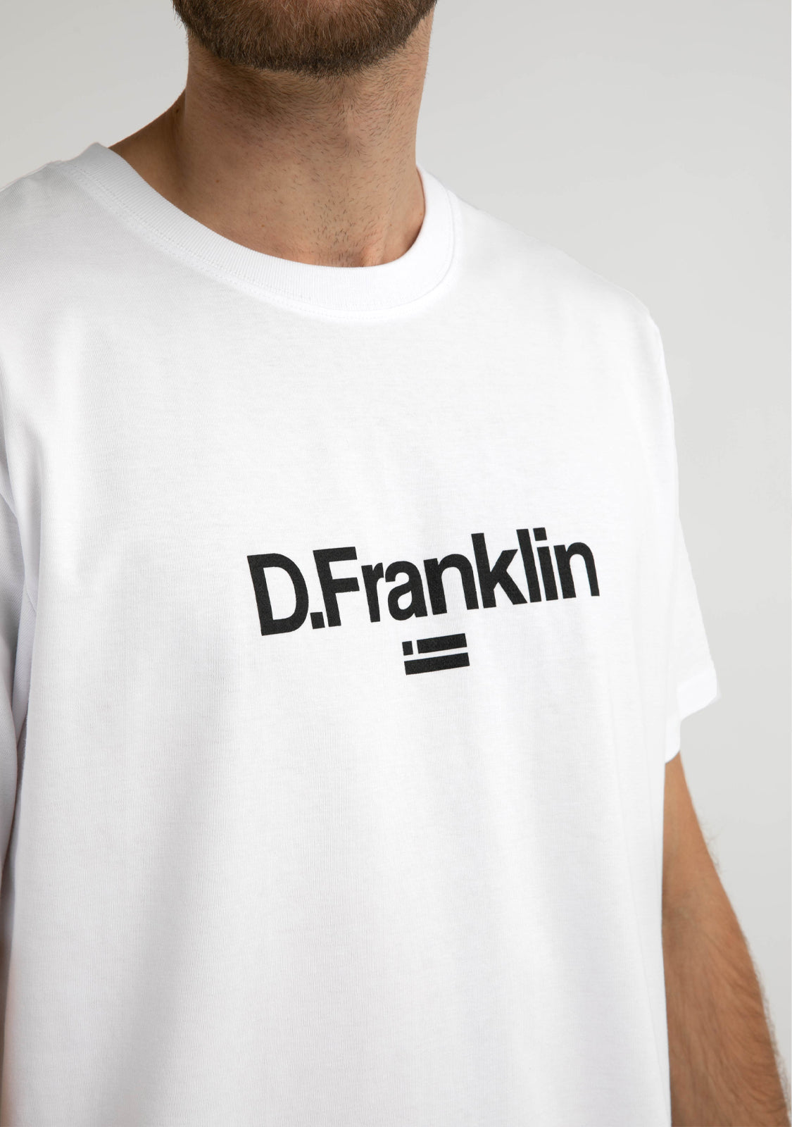 T-shirt blanc qui simplifie l'iconographie de D.Franklin avec le logo et l'emblème de notre marque sur la poitrine en noir. Col rond avec double couture. Fabriqué à partir de 100% coton biologique.