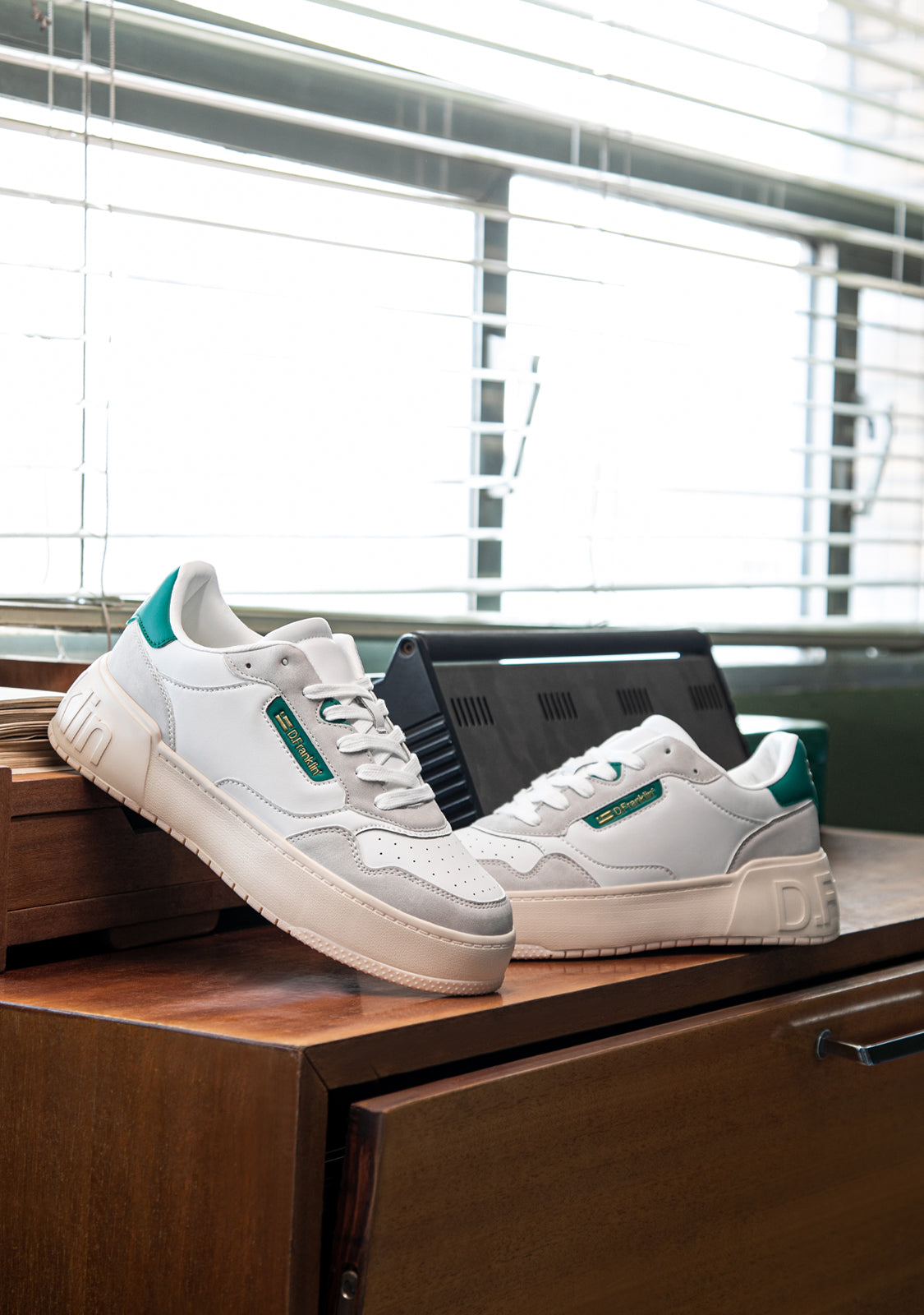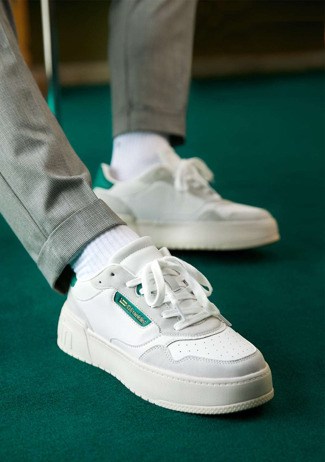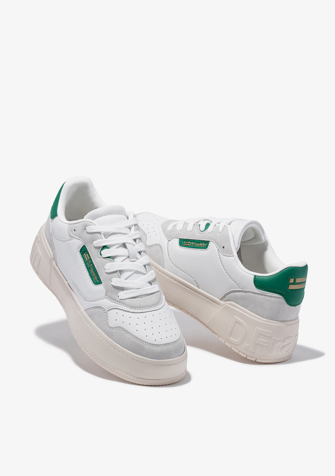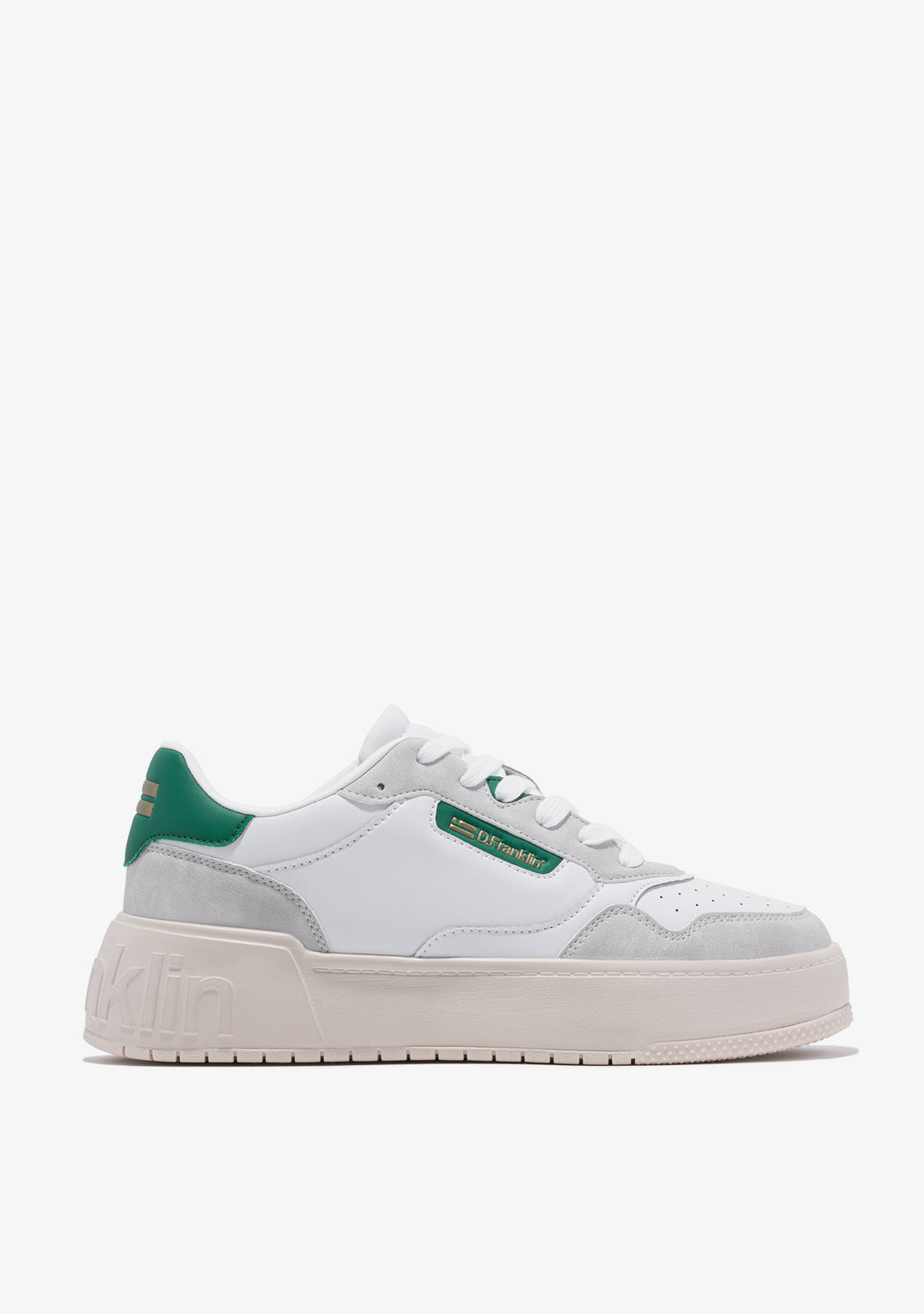 Une approche raffinée inspirée par la scène du basket des 'années 90'. Entraîneur minimaliste avec un talon et un emblème D.Franklin sur le côté en ton doré sur vert. Parties grises contrastantes sur du cuir synthétique végan blanc. Construit avec une semelle en caoutchouc. Logo D.Franklin embossé sur le talon. Lacets en coton. Semelle de 4 cm.