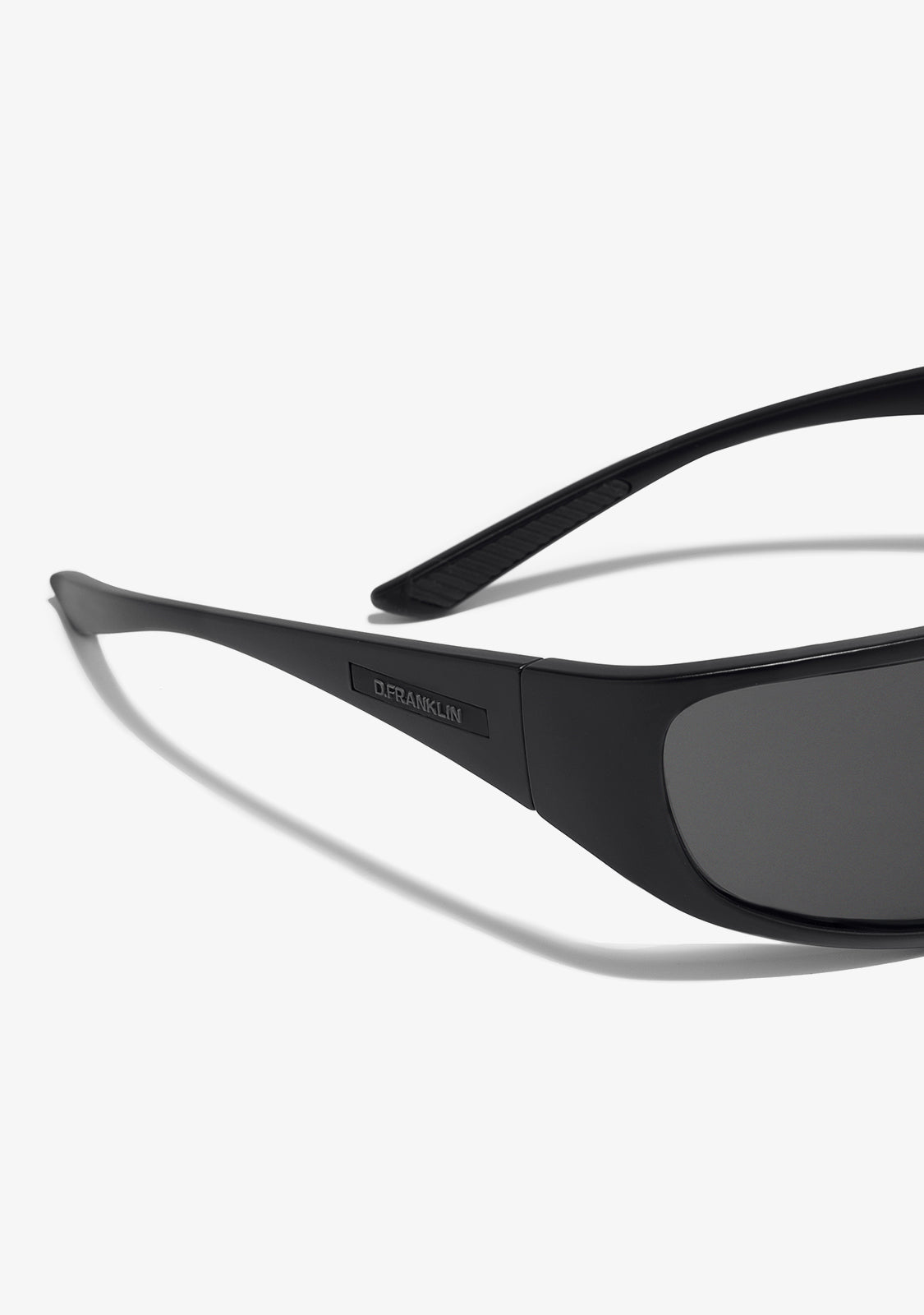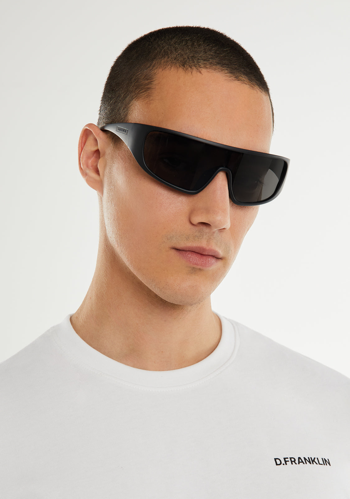 Ce modèle présente une monture en finition mate noire avec une esthétique courbée. Il est équipé de verres teintés fumés et de notre emblème signature sur le côté des branches. La largeur uniforme des verres de 131 mm et le cadre avant de 145 mm sont reliés par une branche de 130 mm.
