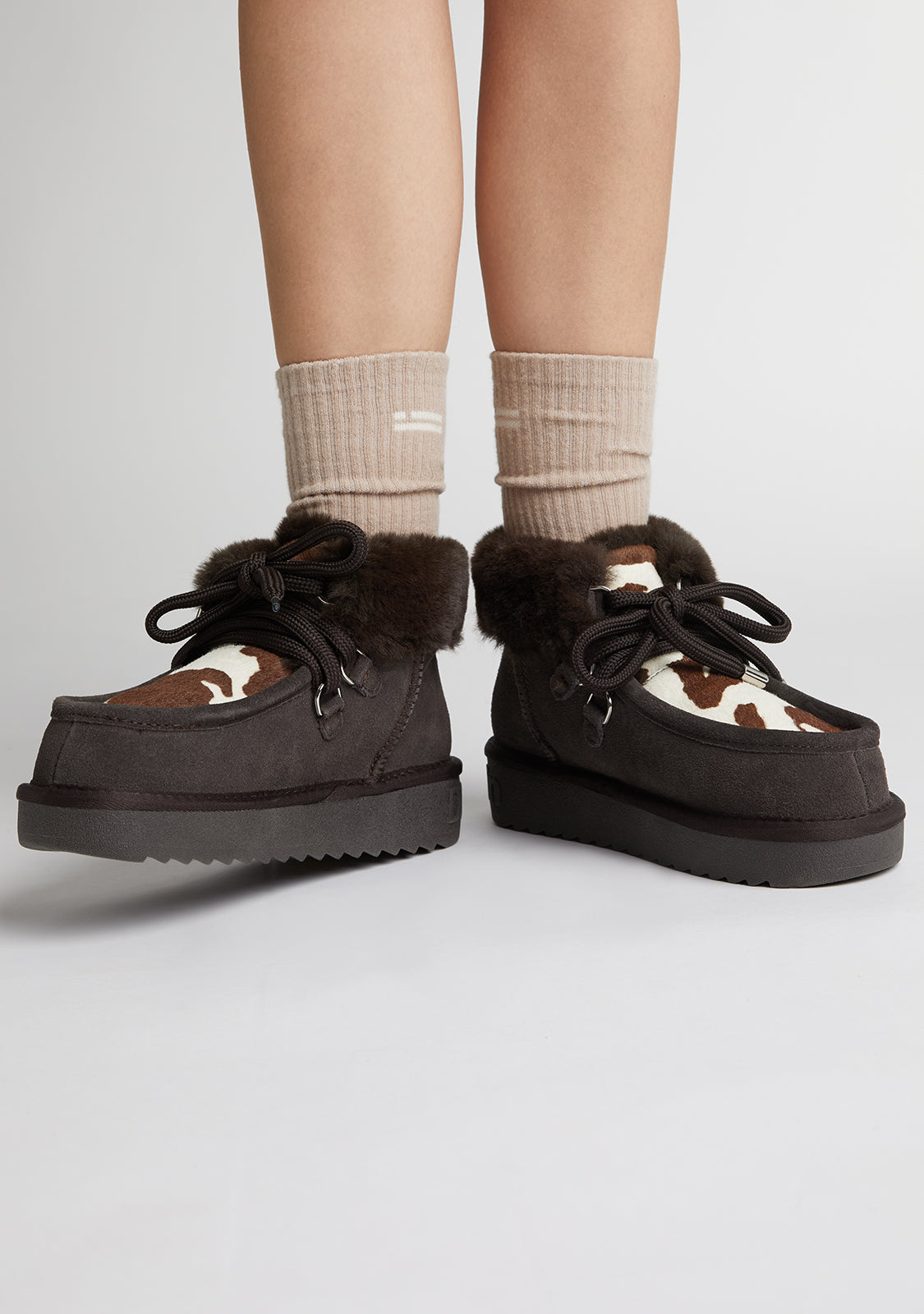 La semelle en caoutchouc garantit une excellente adhérence et une stabilité, tandis que les lacets oversize offrent non seulement un maintien sûr, mais aussi un look percutant qui les distingue sur le marché. Conçues en cuir suédé premium, ces bottes sont faites pour durer. L’imprimé façon vache donne une touche originale et accrocheuse à votre dressing d’hiver.