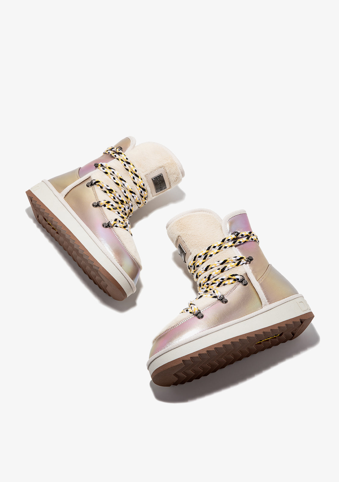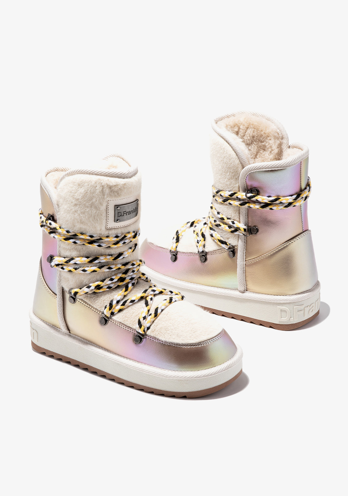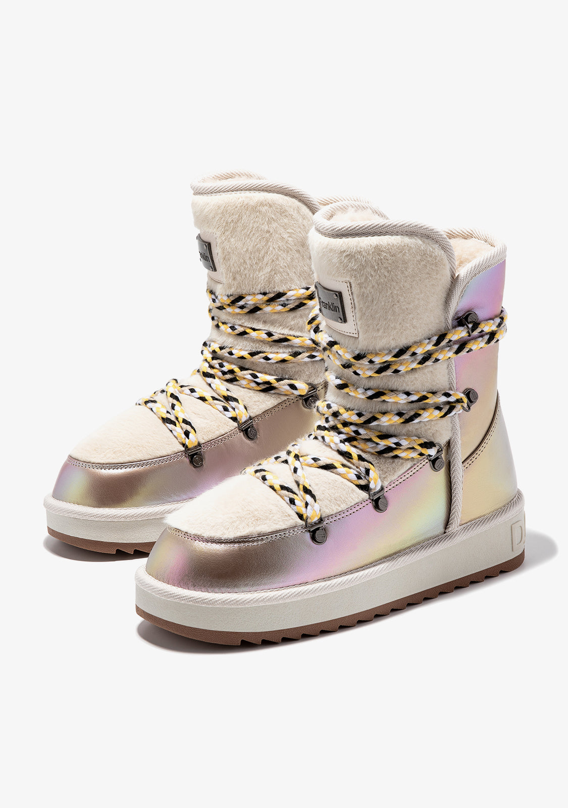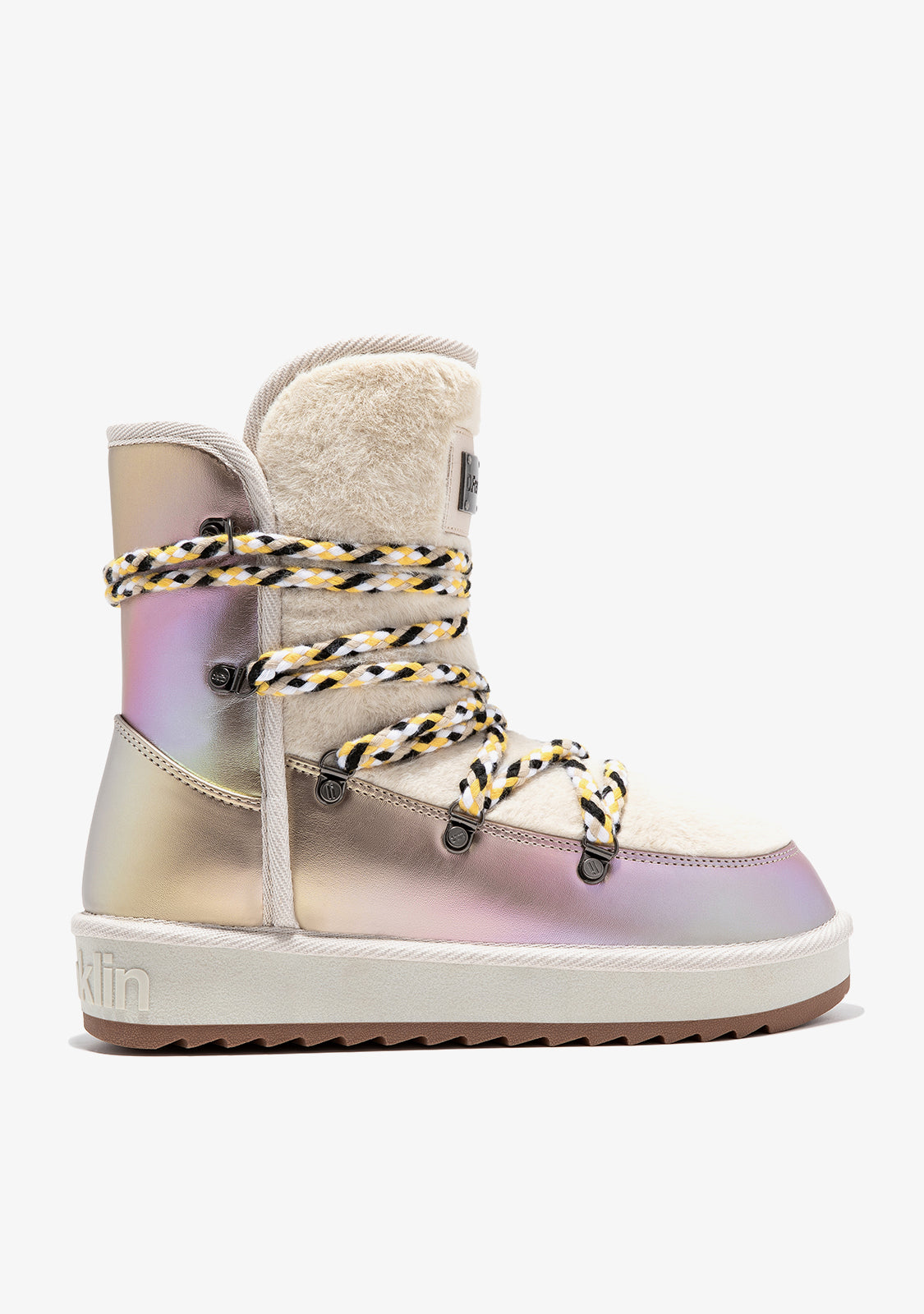 Ces bottes iridescentes beiges sont fabriquées en tissu microfibre de haute qualité, résistant à l'eau. Une semelle redessinée les rend plus légères pour un confort accru. Elles disposent également de notre badge de talon personnalisé. Les lacets de style montagne à multi-positions offrent un soutien optimal et des détails réfléchissants. De plus, une doublure en fausse fourrure ajoute la touche ultime pour l'hiver.