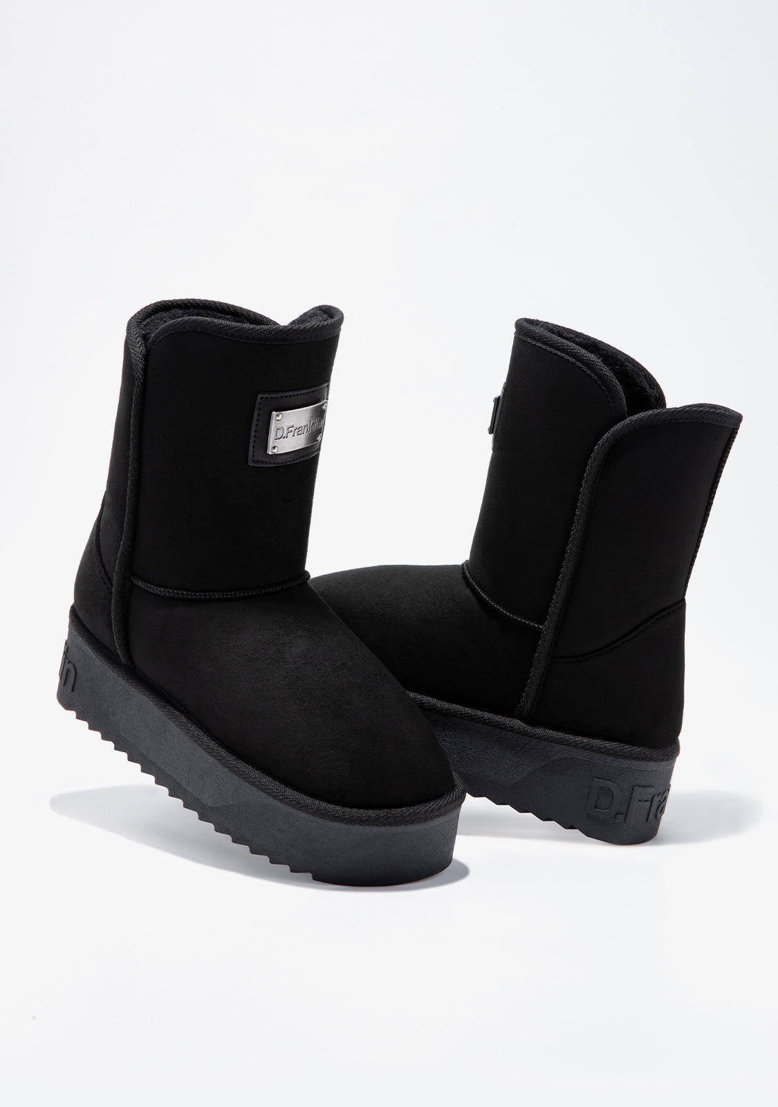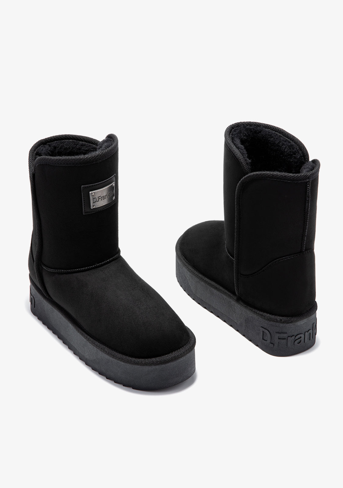 Ces bottes noires à coupe basse sont fabriquées en tissu de microfibre résistant à l'eau de haute qualité. La semelle redessinée offre un poids plus léger pour un confort accru. Elles disposent également de notre badge de talon personnalisé et d'une semelle contrastante. De plus, sa doublure en fourrure synthétique lui confère la touche hivernale ultime.