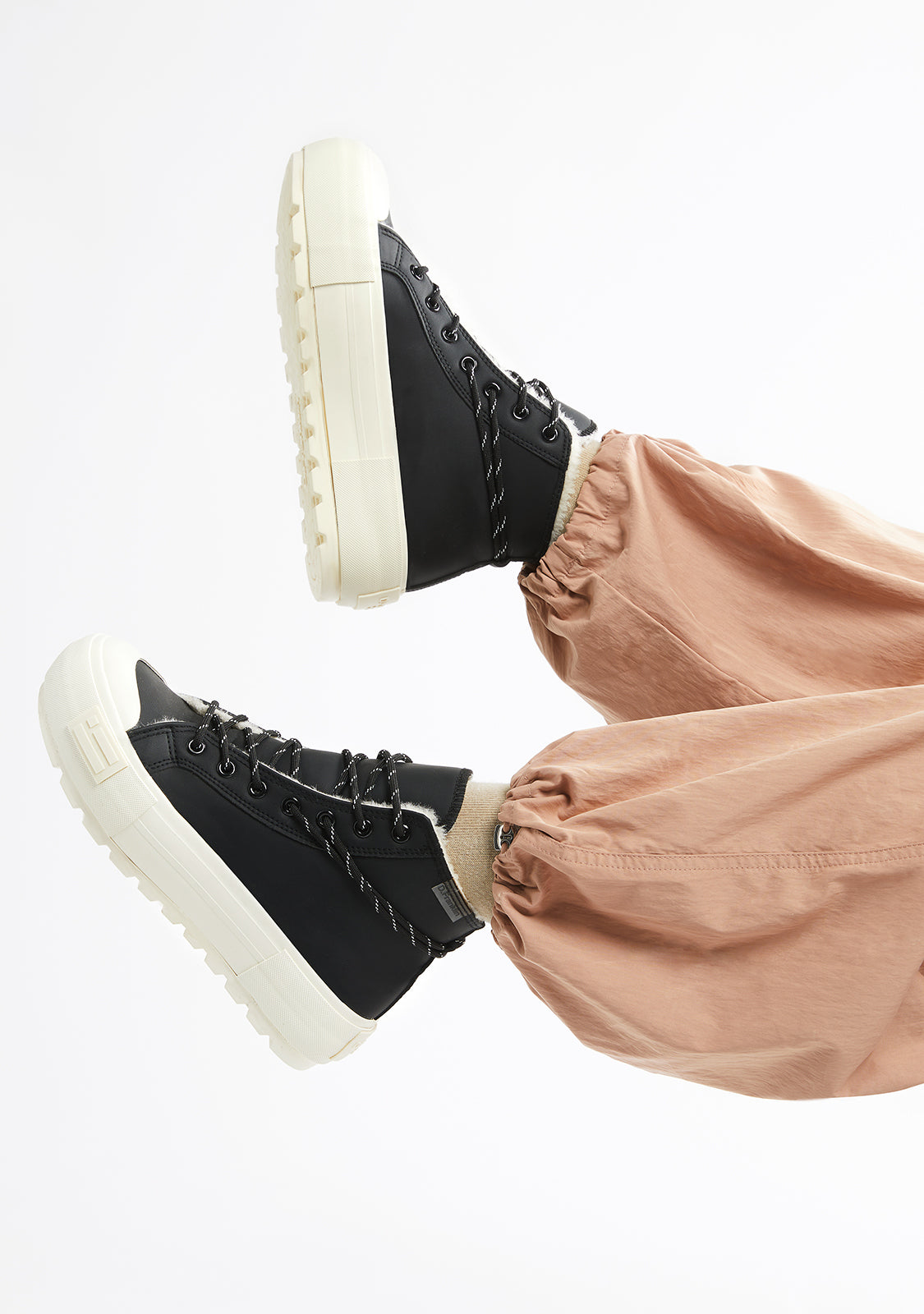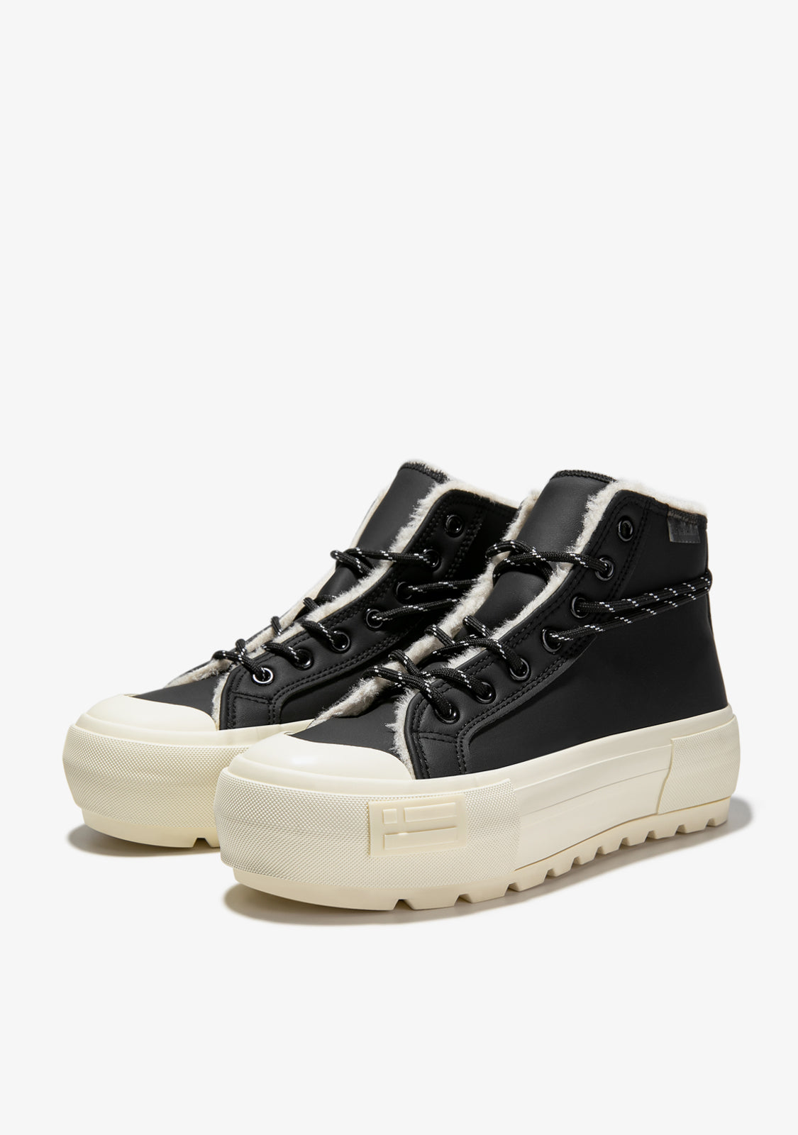 Nos baskets avec fourrure à l'intérieur allient confort et chaleur dans une botte à cheville noire. Lacets multi-positions pour une esthétique urbaine et un maintien sécurisé. La semelle de 5 cm arbore notre emblème à la fois sur le talon et sur l'avant-pied.