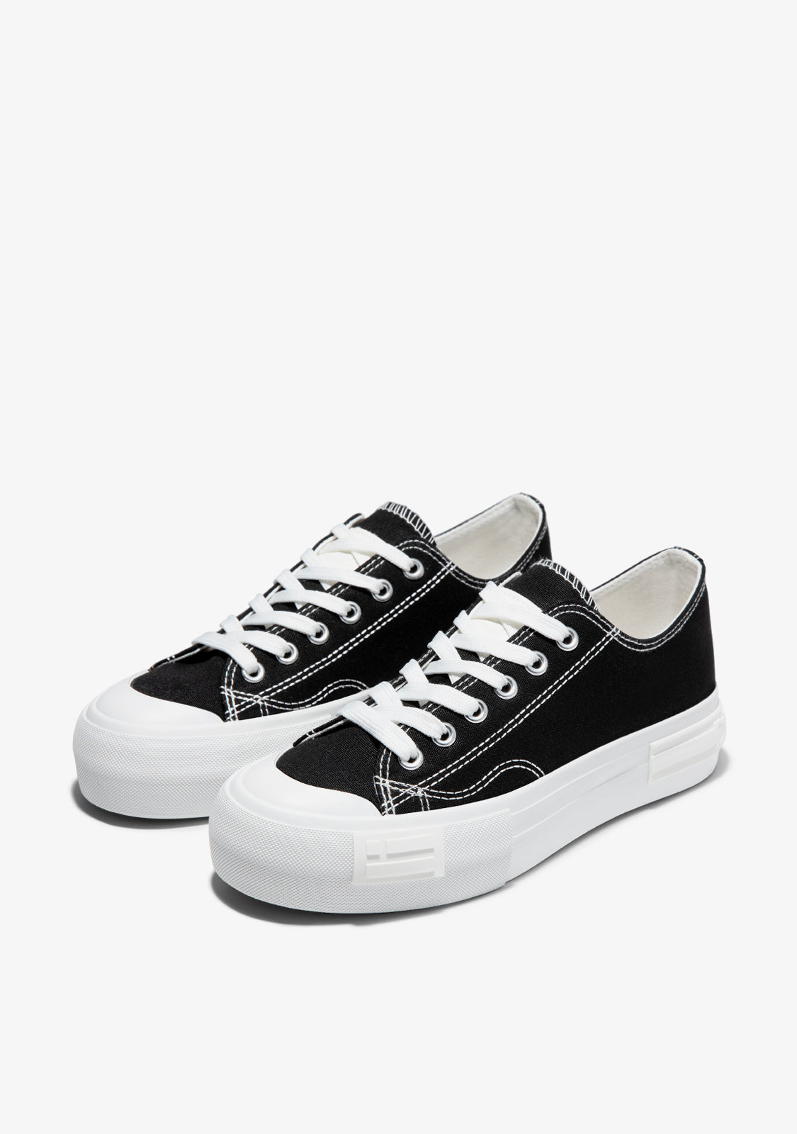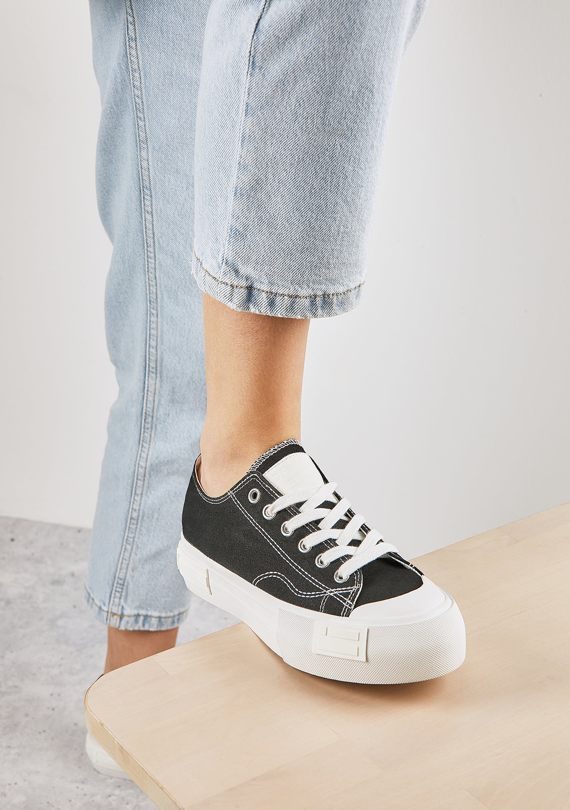 Notre design noir One Way est construit en textile en toile. Semelle en caoutchouc blanche et lettrage personnalisé sur le talon. Doté d'une hauteur de 4 cm et de notre emblème de drapeau sur le côté.
