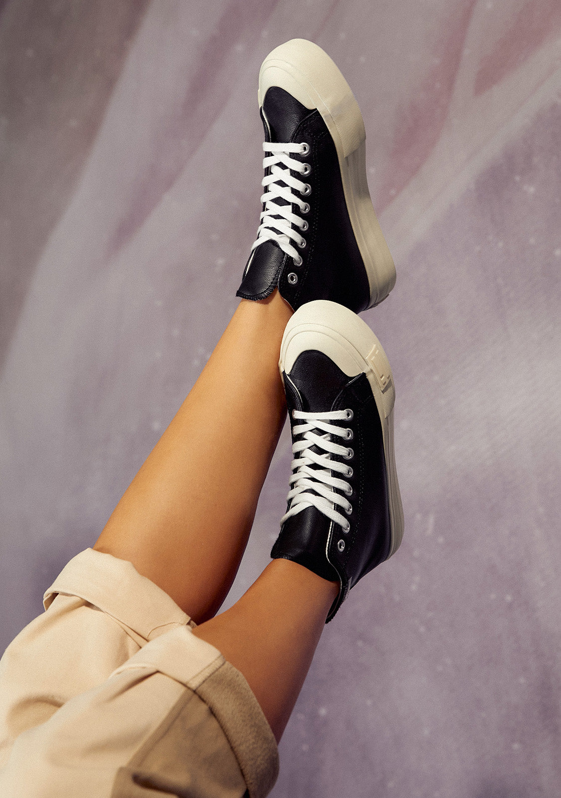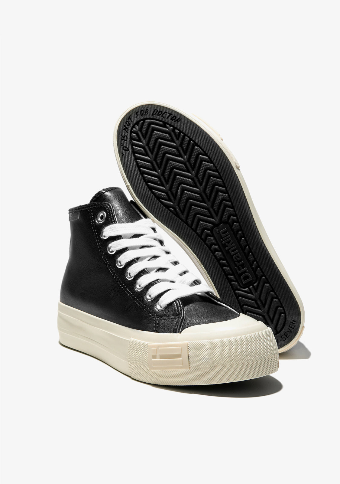 Le design à coupe basse est construit en cuir synthétique noir et en microfibre. Semelle en caoutchouc monochrome blanche de 4 cm avec l'emblème D.Franklin en haut du tige et le lettrage de la marque sur le talon.