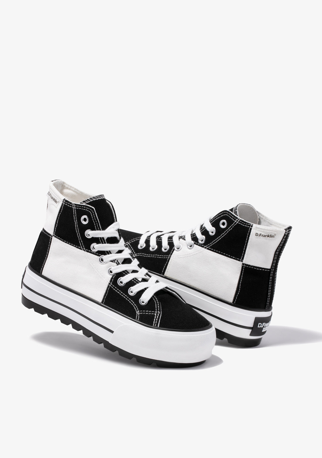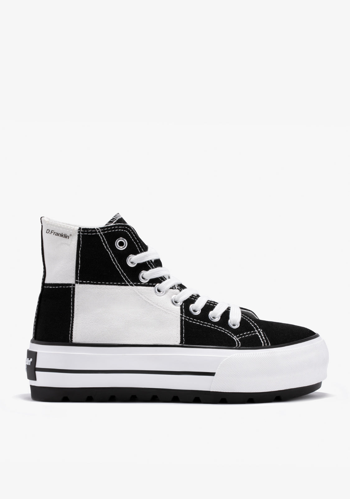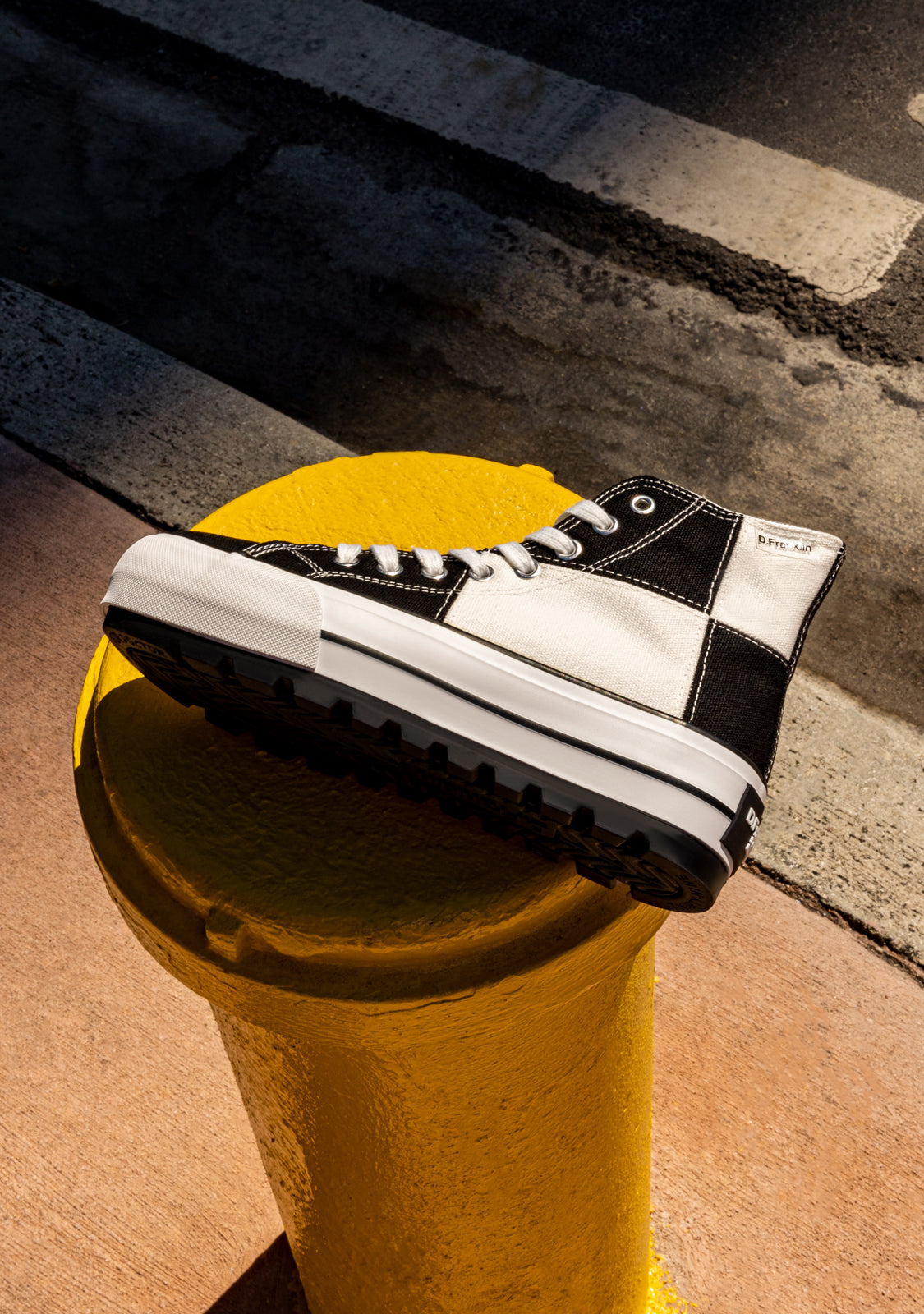 Une version rétro de la classique One Way chaussure montante. Conçue dans un motif à carreaux noir et blanc. Construite avec une semelle blanche légère de 5 cm de grip supplémentaire. Logo noir embossé sur le talon. Lacets en coton blancs.