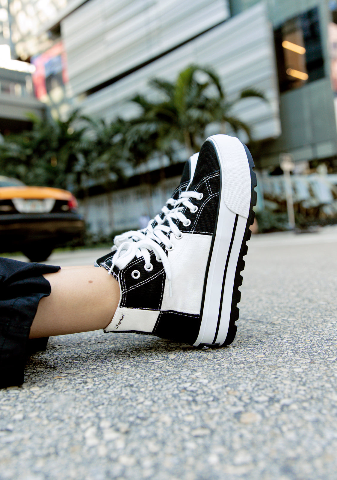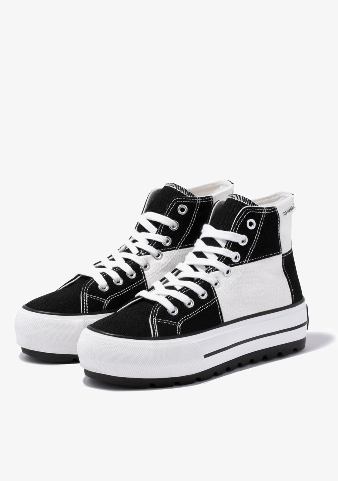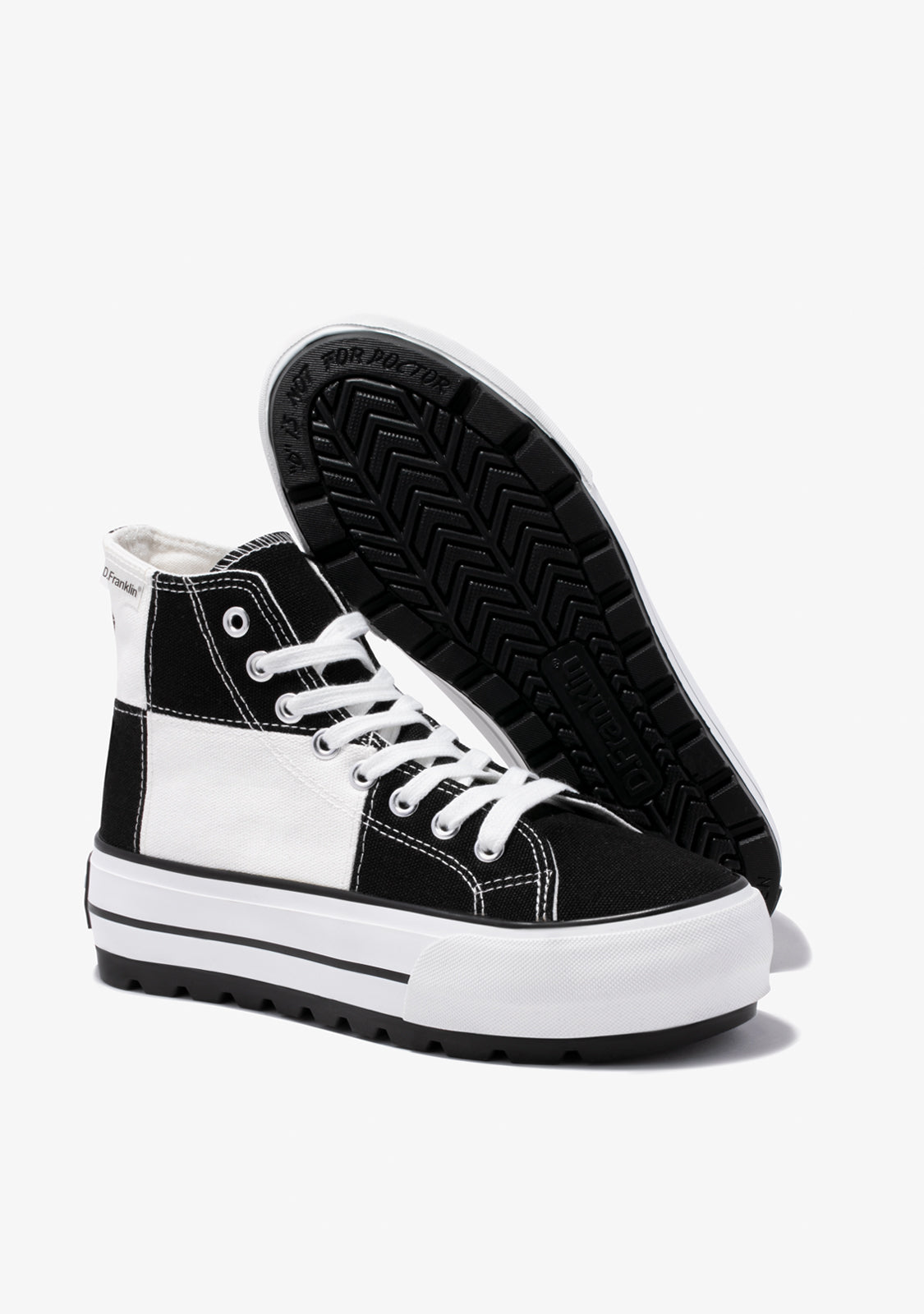 Une version rétro de la classique One Way chaussure montante. Conçue dans un motif à carreaux noir et blanc. Construite avec une semelle blanche légère de 5 cm de grip supplémentaire. Logo noir embossé sur le talon. Lacets en coton blancs.