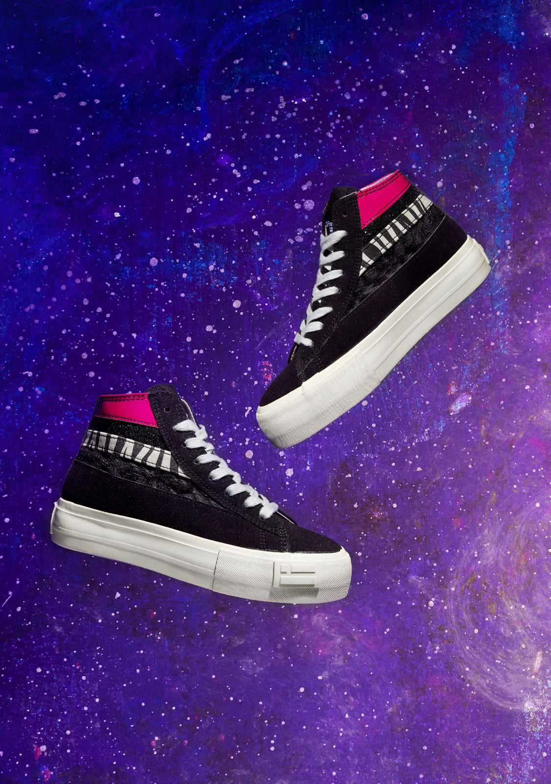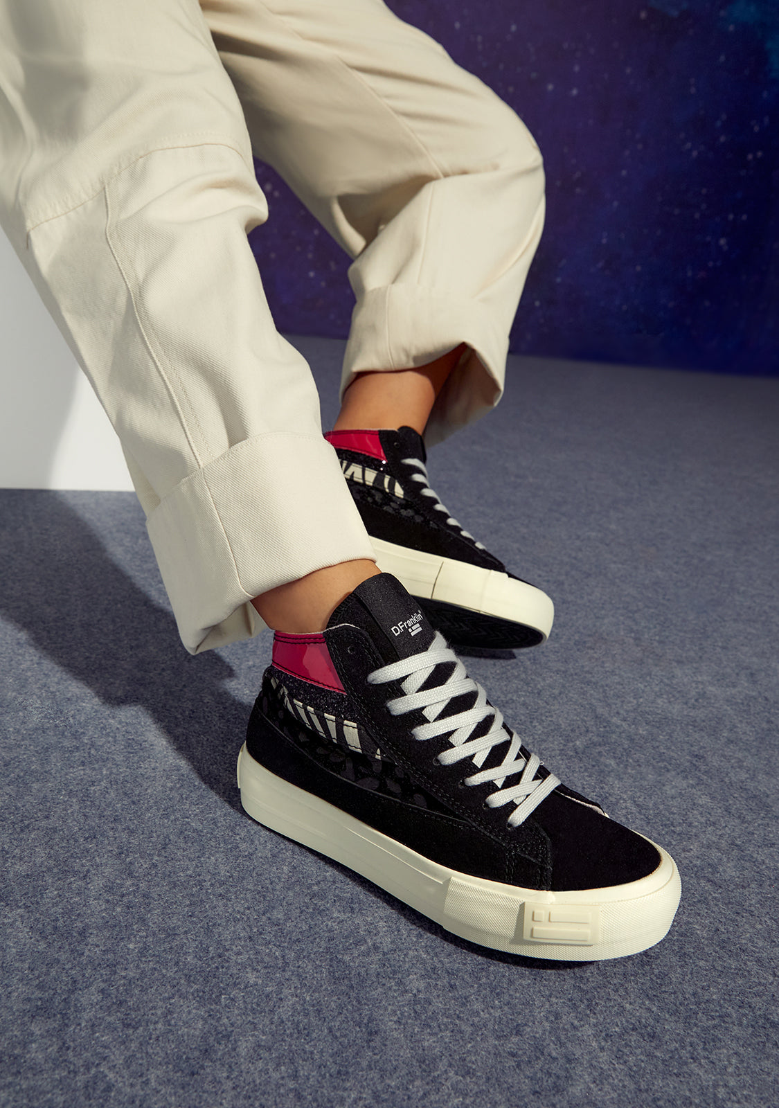 Baskets montantes D.Franklin conçues avec une combinaison audacieuse de matériaux et de textures. Une proposition défiant la convention pour laisser une empreinte à chaque pas.