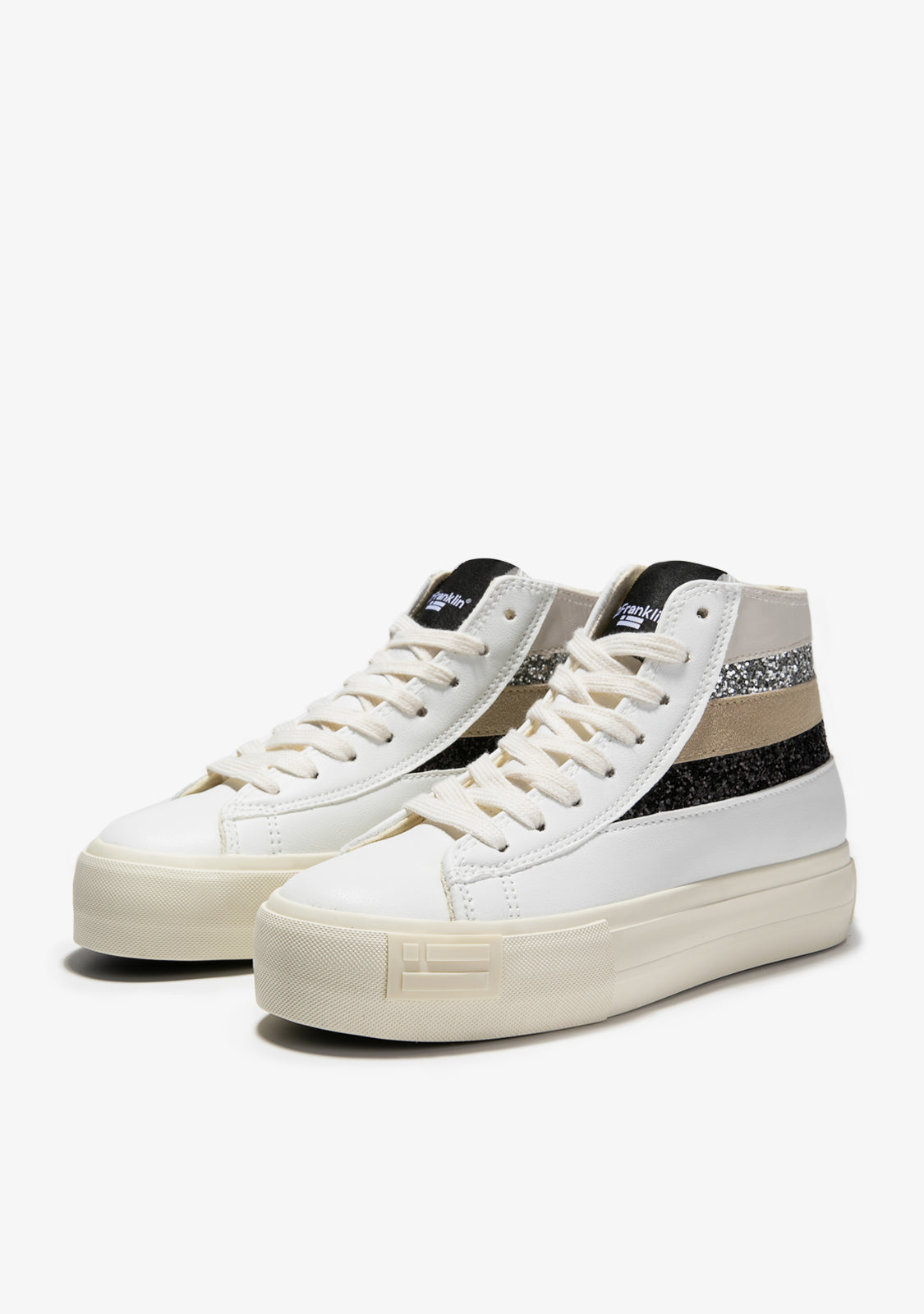 Ce modèle est construit en cuir synthétique blanc et une combinaison de rayures sur le côté en microfibre. Des rayures en paillettes noires et argentées, ainsi qu'en cuir synthétique blanc et beige composent ce design de botte de cheville. Semelle en caoutchouc monochrome blanche de 4 cm avec emblème D.Franklin sur le côté et lettrage sur le talon. Semelle intérieure thermoformée en EVA injecté.