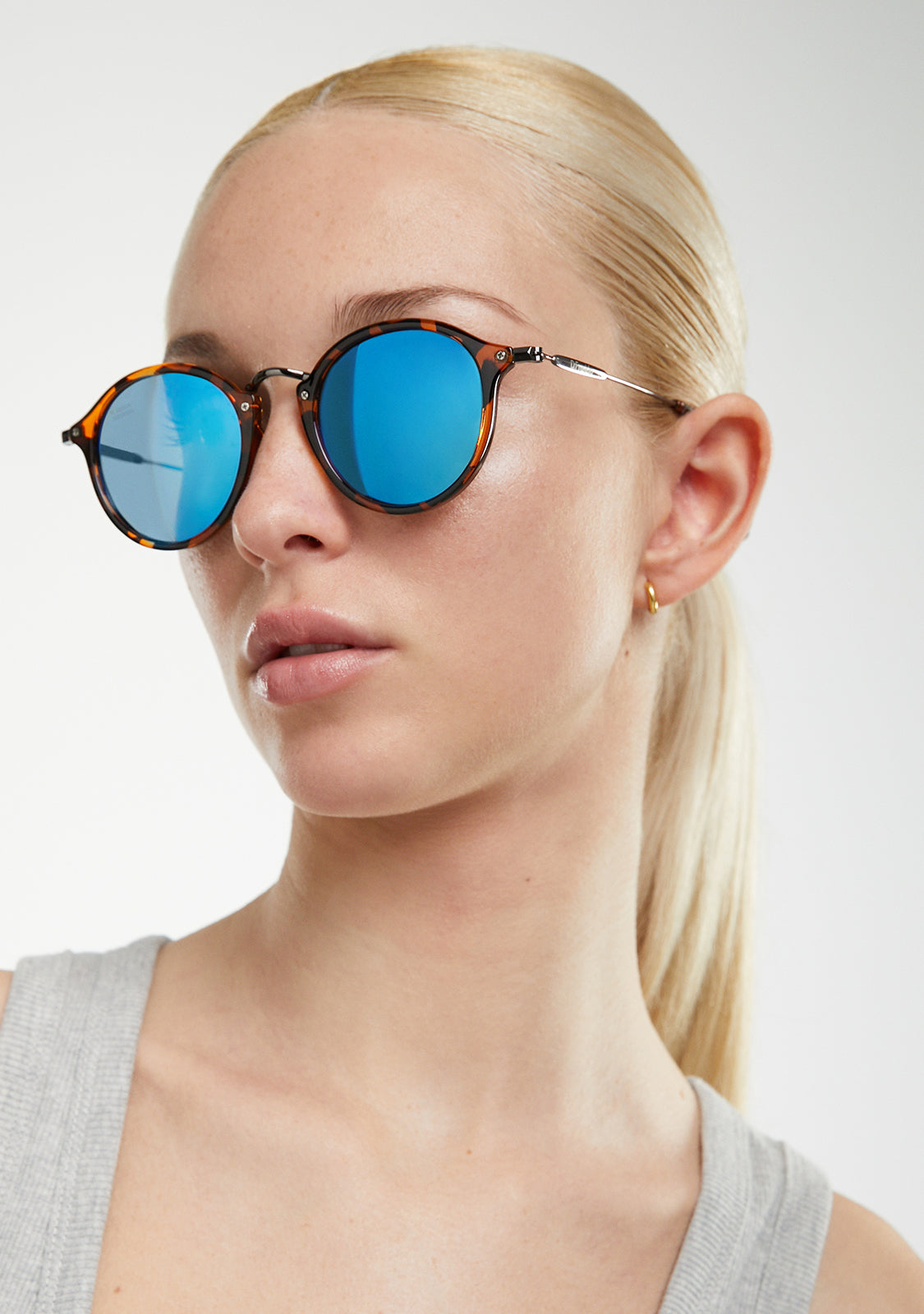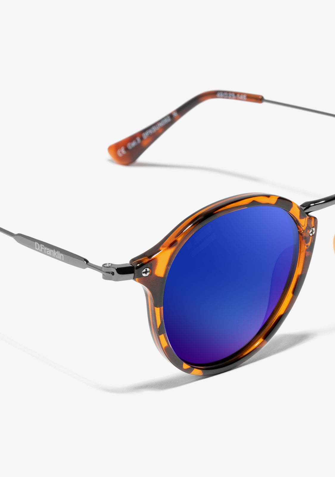 Des verres ronds, miroir bleu fumé et des montures en écaille de tortue renforcent l'esthétique des années soixante-dix de ce modèle. Il présente nos détails emblématiques D.Franklin : le logo gravé sur les deux branches en métal et notre emblème sur le verre droit. Avec une largeur de verre de 49 mm et une largeur de face de 148 mm, ces lunettes flatteront la plupart des visages. Les branches mesurent 145 mm de long.