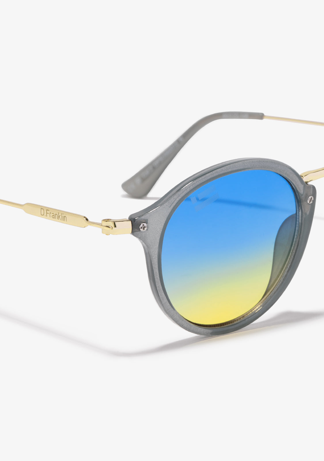 Des verres ronds bleus et des tons de monture assortis renforcent le look des années soixante-dix de ce modèle. Il présente nos détails emblématiques D.Franklin : le logo gravé sur les deux branches métalliques et notre emblème sur le verre droit. Avec une largeur de verre de 49 mm et un cadre avant de 148 mm, ces lunettes conviennent à la plupart des visages. Les branches mesurent 145 mm de long.