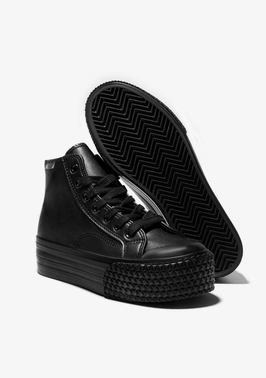 Baskets montantes construites en cuir synthétique noir et microfibre. Semelle en caoutchouc monochrome noire de 4,5 cm avec l'emblème D.Franklin en haut de la tige et le lettrage de la marque sur le talon. Semelle intérieure en EVA injecté thermoformé.