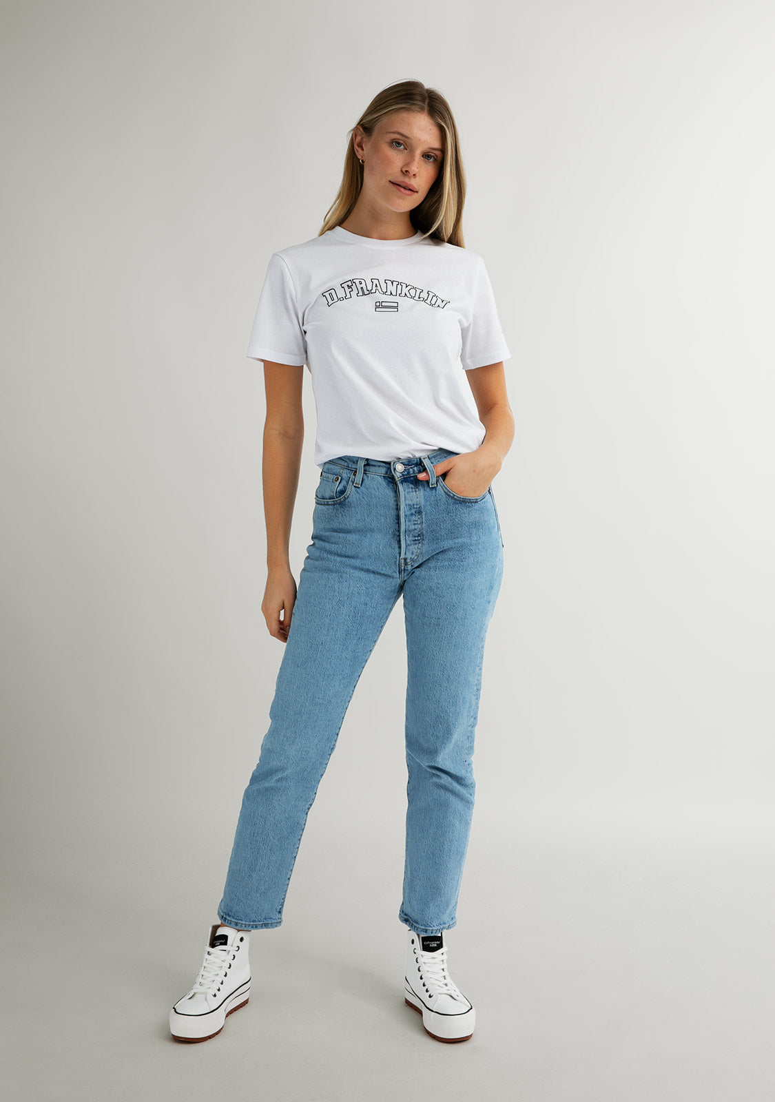 T-shirt blanc à manches courtes avec le contour du logo noir D.Franklin. Avant inspiré des universités et des fraternités américaines. Col rond avec double couture. Fabriqué en 100% coton biologique. Modèle féminin.