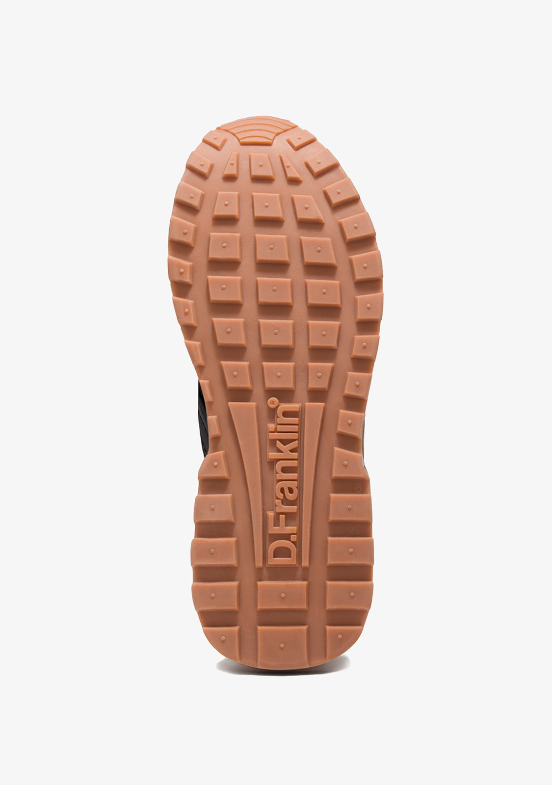 L'extérieur en matériau synthétique de haute qualité assure douceur et résistance, tandis que la doublure et la semelle intérieure en matériau synthétique offrent un grand confort tout au long de la journée. La semelle TR avec des détails perforés et une finition pyramidale garantit stabilité et traction, et les lacets de taille proéminente ajoutent la touche finale. L'emblème D.Franklin se trouve sur l'avant, le côté et l'arrière.