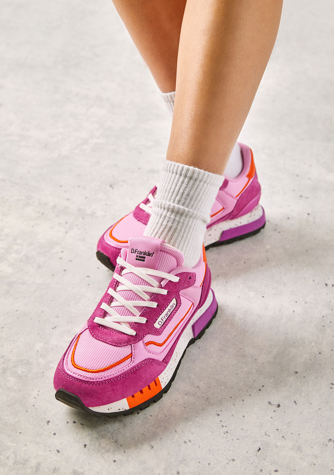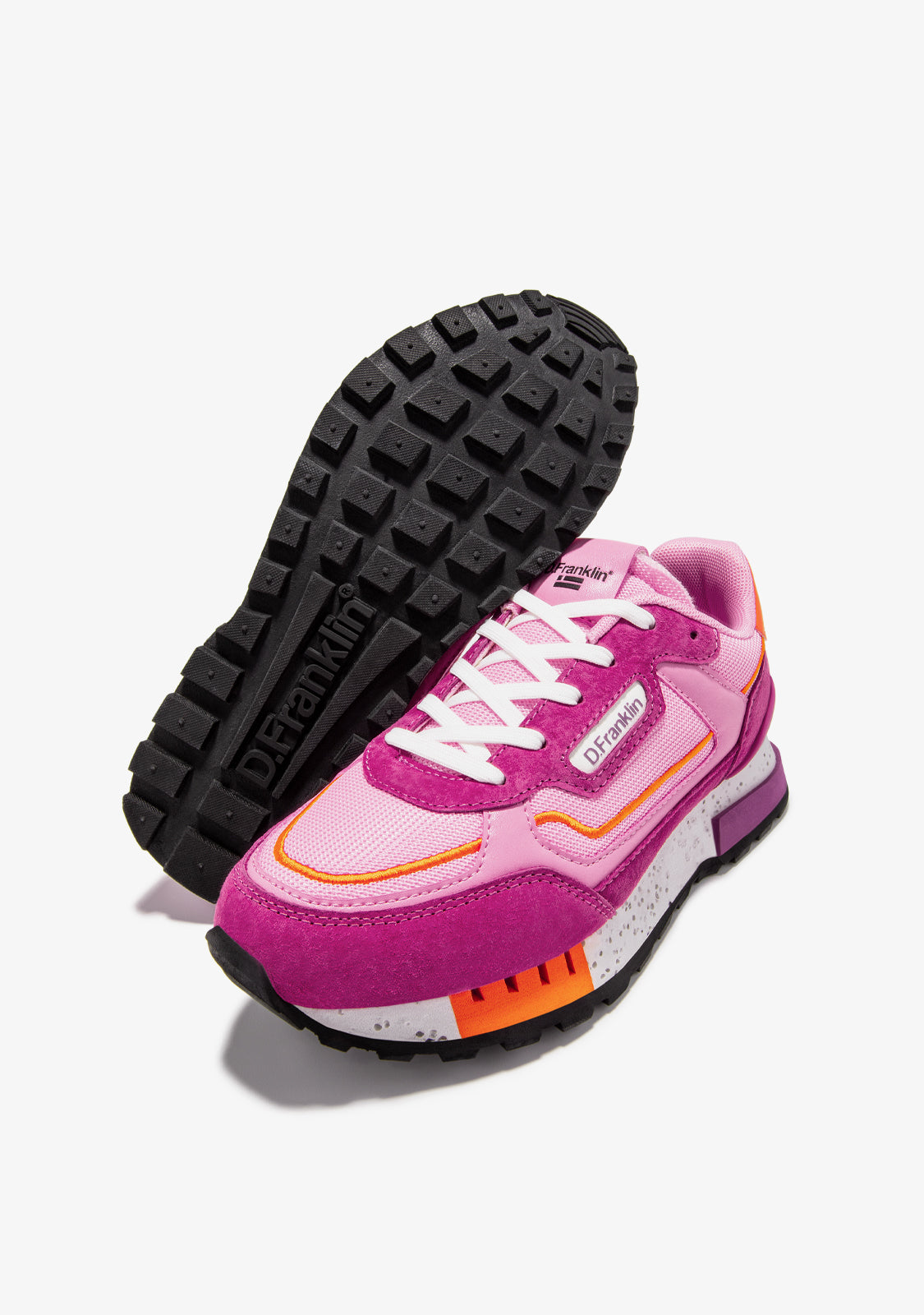 Ces sneakers sont fabriquées avec des détails fuchsia et orange. Elles présentent une semelle TR avec des détails perforés et une finition en pyramide pour un confort et une traction améliorés. Elles disposent également d'une pièce de bout mixte pour plus de flexibilité. Notre emblème se trouve à l'avant et sur le côté ainsi qu'à l'arrière.